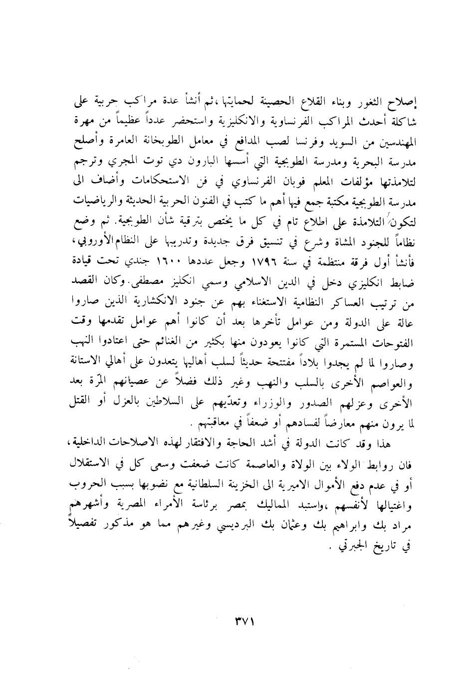 اصلاح الثغور وَبِنَاء القلاع الحصينة لحمايتها ثمَّ انشأ عدَّة مراكب حربية على شاكلة احدث المراكب الفرنساوية والانكليزية واستحضر عددا عَظِيما من مهرَة المهندسين من السويد وفرنسا لصب المدافع فِي معامل الطوبخانة العامرة واصلح مدرسة البحرية ومدرسة الطوبجية الَّتِي اسسها البارون دي توت المجري وَترْجم لتلامذتها مؤلفات الْمعلم فوبان الفرنساوي فِي فن الاستحكامات واضاف إِلَى مدرسة الطوبجية مكتبة جمع فِيهَا اهم مَا كتب فِي الْفُنُون الحربية الحديثة والرياضيات لتَكون التلامذة على اطلَاع تَامّ فِي كل مَا يخْتَص بترقية شَأْن الطوبجية ثمَّ وضع نظاما للجنود المشاة وَشرع فِي تنسيق فرق جَدِيدَة وتدريبها على النظام الاوروبي فَأَنْشَأَ اول فرقة منتظمة فِي سنة 1796 وَجعل عَددهَا 1600 جندي تَحت قيادة ضَابِط انكليزي دخل فِي الدّين الاسلامي وَسمي انكليز مصطفى وَكَانَ الْقَصْد من تَرْتِيب العساكر النظامية الِاسْتِغْنَاء بهم عَن جنود الانكشارية الَّذين صَارُوا عَالَة على الدولة وَمن عوامل تاخرها بعد أَن كَانُوا اهم عوامل تقدمها وَقت الفتوحات المستمرة الَّتِي كَانُوا يعودون مِنْهَا بِكَثِير من الْغَنَائِم حَتَّى اعتادوا النهب وصاروا لما لم يَجدوا بلادا مفتتحة حَدِيثا لسلب اهاليها يتعدون على اهالي الاستانة والعواصم الاخرى بالسلب والنهب وَغير ذَلِك فضلا عَن عصيانهم الْمرة بعد الاخرى وعزلهم الصُّدُور والوزراء وتعديهم على السلاطين بِالْعَزْلِ أَو الْقَتْل لما يرَوْنَ مِنْهُم مُعَارضا لفسادهم أَو ضعفا فِي معاقبتهم