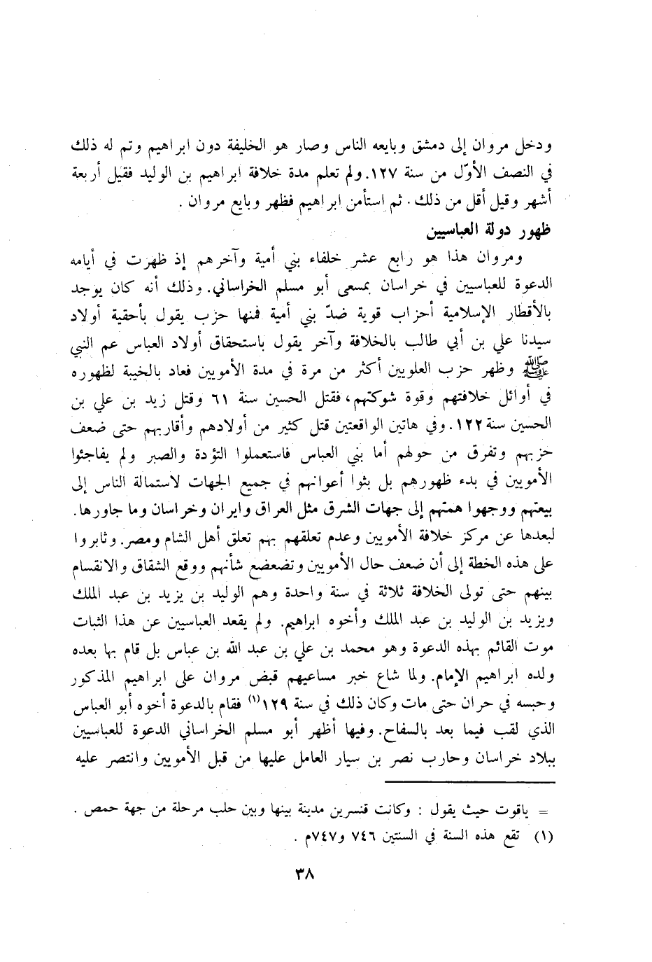 ومروان هَذَا هُوَ رَابِع عشر خلفاء بني امية وَآخرهمْ اذ ظَهرت فِي ايامه الدعْوَة للعباسيين فِي خُرَاسَان بمسعى ابو مُسلم الْخُرَاسَانِي وَذَلِكَ انه كَانَ يُوجد بالاقطار الاسلامية احزاب قوبة ضد بني امية فَمِنْهَا حزب يَقُول باحقية اولاد سيدنَا عَليّ بن ابي طَالب بالخلافة وَآخر يَقُول بِاسْتِحْقَاق اولاد الْعَبَّاس عَم النَّبِي صلى الله عَلَيْهِ وَسلم وَظهر حزب العلويين اكثر من مرّة فِي مُدَّة الامويين فَعَاد بالخيبة لظُهُوره فِي اوائل خلافتهم وَقُوَّة شوكتهم فَقتل الْحُسَيْن سنة 61 وَقتل زيد بن عَليّ بن الْحُسَيْن سنة 122 وَفِي هَاتين الواقعتين قتل كثير من اولادهم واقاربهم حَتَّى ضعف حزبهم وتفرق من حَولهمْ اما بني الْعَبَّاس فاستعملوا التؤدة وَالصَّبْر وَلم يفاجئوا الامويين فِي بَدْء ظُهُورهمْ بل بثوا اعوانهم فِي جَمِيع الْجِهَات لاستمالة النَّاس إِلَى بيعتهم ووجهوا همتهم إِلَى جِهَات الشرق مثل الْعرَاق وايران وخراسان وَمَا جاورها لبعدها عَن مَرْكَز خلَافَة الامويين وَعدم تعلقهم بهم تعلق اهل الشَّام ومصر وثابروا على هَذِه الخطة إِلَى ان ضعف حَال الامويين وتضعضع شانهم وَوَقع الشقاق والانقسام بَينهم حَتَّى تولى الْخلَافَة ثَلَاثَة فِي سنة وَاحِدَة وهم الْوَلِيد بن يزِيد بن عبد الْملك وَيزِيد بن الْوَلِيد بن عبد الْملك واخوه ابراهيم وَلم يقْعد العباسيين عَن هَذَا الثَّبَات موت الْقَائِم بِهَذِهِ الدعْوَة وَهُوَ مُحَمَّد بن عَليّ بن عبد الله بن عَبَّاس بل قَامَ بهَا بعده وَلَده ابراهيم الامام وَلما شاع خبر مساعيهم قبض مَرْوَان على ابراهيم الْمَذْكُور وحبسه فِي حران حَتَّى مَاتَ وَكَانَ ذَلِك فِي سنة 129 فَقَامَ بالدعوة اخوه ابو الْعَبَّاس الَّذِي لقب فِيمَا بعد بالسفاح وفيهَا اظهر ابو مُسلم الْخُرَاسَانِي الدعْوَة للعباسيين بِبِلَاد خُرَاسَان وَحَارب نصر بن سيار الْعَامِل عَلَيْهَا من قبل الامويين وانتصر عَلَيْهِ