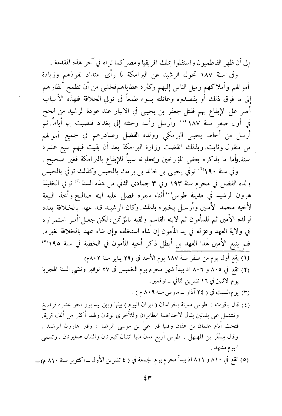 إِلَى ان ظهر الفاطميون واستقلوا بِملك افريقيا ومصر كَمَا ترَاهُ فِي آخر هَذِه الْمُقدمَة وَفِي سنة 187 تحول الرشيد عَن البرامكة لما راى امتداد نفوذهم وَزِيَادَة اموالهم واملاكهم وميل النَّاس اليهم وَكَثْرَة عطاياهم فخشى من ان تطمح انظارهم إِلَى مَا فَوق ذَلِك اَوْ يقصدوه وعائلته بِسوء طَمَعا فِي تولي الْخلَافَة فلهذه الاسباب اصر على الايقاع بهم فَقتل جَعْفَر بن يحيى فِي الانبار عِنْد عودة الرشيد من الْحَج فِي اول صفر سنة 187 وارسل راسه وجثته إِلَى بَغْدَاد فَنصبت بهَا اياما ثمَّ ارسل من احاط يحيى الْبَرْمَكِي وَولده الْفضل وصادرهم فِي جَمِيع اموالهم من مَنْقُول وثابت وَبِذَلِك انْقَضتْ وزارة البرامكة بعد ان بقيت فيهم سبع عشرَة سنة واما مَا يذكرهُ بعض المؤرخين ويجعلونه سَببا للايقاع بالبرامكة فَغير صَحِيح