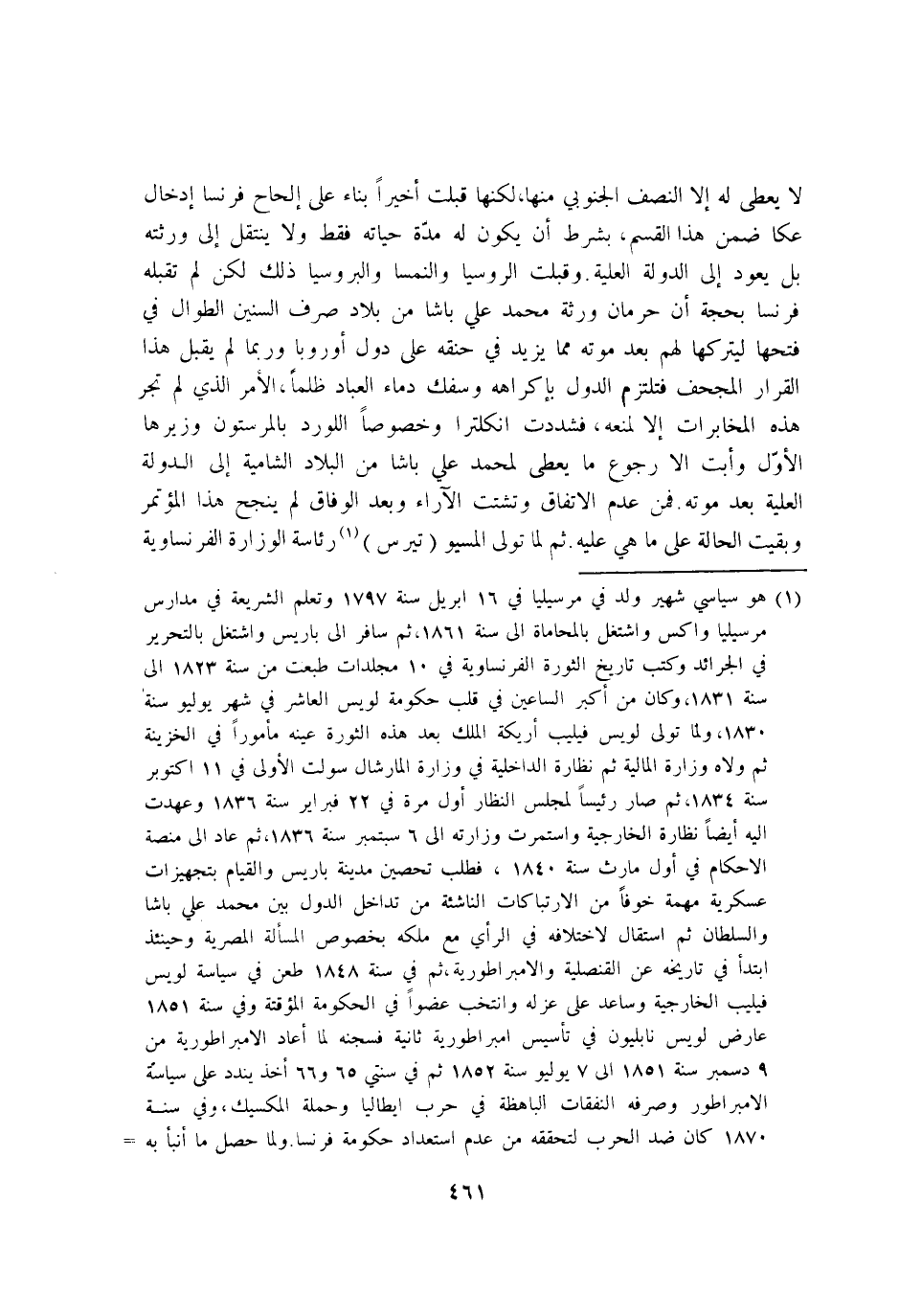 لَا يعْطى لَهُ الا النّصْف الجنوبي مِنْهَا لَكِنَّهَا قبلت اخيرا بِنَاء على الحاح فرنسا ادخال عكا ضمن هَذَا الْقسم بِشَرْط ان يكون لَهُ مُدَّة حَيَاته فَقَط وَلَا ينْتَقل إِلَى ورثته بل يعود إِلَى الدولة الْعلية وَقبلت الروسيا والنمسا والبروسيا ذَلِك لَكِن لم تقبله فرنسا بِحجَّة ان حرمَان وَرَثَة مُحَمَّد عَليّ باشا من بِلَاد صرف السنين الطوَال فِي فتحهَا ليتركها لَهُم بعد مَوته مِمَّا يزِيد فِي حنقه على دوَل اوروبا وَرُبمَا لم يقبل هَذَا الْقَرار المجحف فتلتزم الدول باكراهه وَسَفك دِمَاء الْعباد ظلما الامر الَّذِي لم تجر هَذِه المخابرات الا لمَنعه فشددت انكلترا وخصوصا اللورد بالمرستون وزيرها الاول وابت الا رُجُوع مَا يعْطى لمُحَمد عَليّ باشا من الْبِلَاد الشامية إِلَى الدولة الْعلية بعد مَوته فَمن عدم الِاتِّفَاق وتشتت الآراء وَبعد الْوِفَاق لم ينجح هَذَا المؤتمر وَبقيت الْحَالة على ماهي عَلَيْهِ ثمَّ لما تولى المسيو تيرس رئاسة الوزارة الفرنساوية