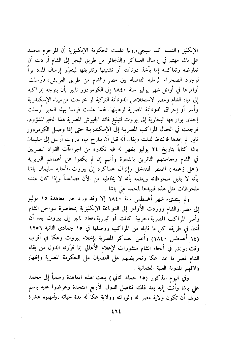 الانكليز والنمسا كَمَا سَيَجِيءُ وَلما علمت الْحُكُومَة الانكليزية ان المرحوم مُحَمَّد عَليّ باشا مهتم فِي ارسال العساكر والذخائر من طَرِيق الْبَحْر إِلَى الشَّام ارادت ان تعارضه وتعاكسه اما باخذ دونانمته اَوْ تشتيتها وتفريقها ليتعذر ارسال المدد برا لوُجُود الصَّحرَاء الرملية الفاصلة بَين مصر وَالشَّام من طَرِيق الْعَريش فَأرْسلت اوامرها فِي اوائل شهر يوليو سنة 1840 إِلَى الكومودور نابير بِأَن يتَوَجَّه بمراكبه إِلَى مياه الشَّام ومصر لاستخلاص الدونانمة التركية لَو خرجت من ميناء الاسكندرية واسر اَوْ احراق الدونانمة المصرية لَو قابلها فَلَمَّا علمت فرنسا بِهَذَا الْخَبَر أرْسلت إِحْدَى بوارجها البخارية إِلَى بيروت لتبليغ قَائِد الجيوش المصرية هَذَا الْخَبَر المشؤوم فَرَجَعت فِي الْحَال المراكب المصرية إِلَى الاسكندرية حَتَّى إِذا وصل الكومودور نابير لم يجدهَا فاغتاظ لذَلِك وَيُقَال انه قبل ان يبارح مياه بيروت ارسل إِلَى سُلَيْمَان باشا كتابا بتاريخ 24 يوليو يظْهر لَهُ فِيهِ تكدره من اجراءآت القواد المصريين فِي الشَّام ومعاملتهم الثائرين بالقسوة وانهم ان لم يكفوا عَن اعمالهم البربرية على زَعمه اضْطر للتدخل وانزال عساكره إِلَى بيروت فاجابه سُلَيْمَان باشا بانه لَا يقبل ملحوظاته ويعلمه بانه لَا يخاطبه من الْآن فَصَاعِدا وَإِذا كَانَ عِنْده ملحوظات مثل هَذِه فليبدها لمُحَمد عَليّ باشا