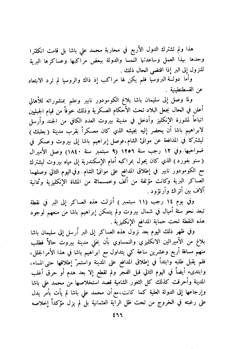 وَفِي ظهر ذَلِك الْيَوْم بعد نزُول هَذِه العساكر إِلَى الْبر ارسل إِلَى سُلَيْمَان باشا بَلَاغ من الاميرالين الانكليزي والنمساوي بَان يخلي مَدِينَة بيروت حَالا فَطلب مِنْهُم مَسَافَة ارْبَعْ وَعشْرين سَاعَة كي يتداول مَعَ ابراهيم باشا فِي هَذَا الامر الجلل فَلم يقبل طلبه وابتدأ فِي اطلاق المدافع على الْمَدِينَة وَاسْتمرّ اطلاقها حَتَّى الْمسَاء وابتدئ ايضا فِي الْيَوْم التَّالِي قبل الْفجْر وَلم تقطع الا بعد هدم اَوْ حرق اغلب الْمَدِينَة واحرقت كَذَلِك كل الثغور الشامية قصد استخلاصها من مُحَمَّد عَليّ باشا وارجاعها إِلَى الدولة الْعلية كَمَا كَانَت مَعَ ان مُحَمَّد عَليّ باشا لم يَأْتِ بامر يدل على رغبته فِي الْخُرُوج من تَحت ظلّ الرَّايَة العثمانية بل لم يزل مؤكدا اخلاصه