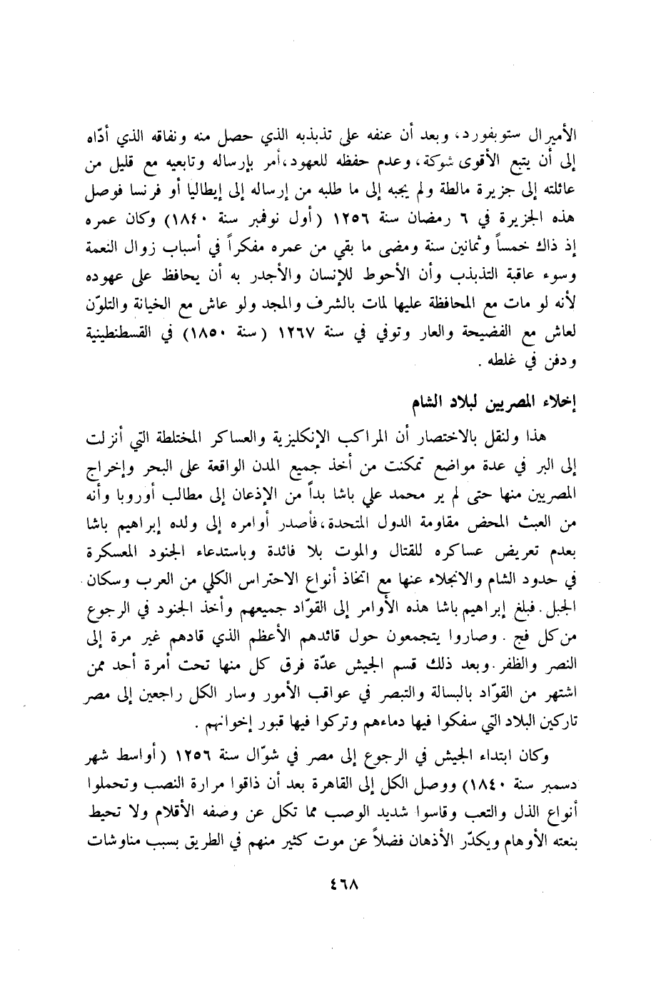 هَذَا ولنقل بالاختصار ان المراكب الانكليزية والعساكر المختلطة الَّتِي انزلت إِلَى الْبر فِي عدَّة مَوَاضِع تمكنت من اخذ جَمِيع المدن الْوَاقِعَة على الْبَحْر واخراج المصريين مِنْهَا حَتَّى لم ير مُحَمَّد عَليّ باشا بدا من الاذعان إِلَى مطَالب اوروبا وانه من الْعَبَث الْمَحْض مقاومة الدول المتحدة فاصدر اوامره إِلَى وَلَده ابراهيم باشا بِعَدَمِ تَعْرِيض عساكره لِلْقِتَالِ وَالْمَوْت بِلَا فَائِدَة وباستدعاء الْجنُود المعسكرة فِي حُدُود الشَّام والانجلاء عَنْهَا مَعَ اتِّخَاذ انواع الاحتراس الْكُلِّي من الْعَرَب وسكان الْجَبَل فَبلغ ابراهيم باشا هَذِه الاوامر إِلَى القواد جَمِيعهم واخذ الْجنُود فِي الرُّجُوع من كل فج وصاروا يتجمعون حول قائدهم الاعظم الَّذِي قادهم غير مرّة إِلَى النَّصْر وَالظفر وَبعد ذَلِك قسم الْجَيْش عدَّة فرق كل مِنْهَا تَحت امرة اُحْدُ مِمَّن اشْتهر من القواد بالبسالة والتبصر فِي عواقب الامور وَسَار الْكل رَاجِعين إِلَى مصر تاركين الْبِلَاد الَّتِي سَفَكُوا فِيهَا دِمَاءَهُمْ وَتركُوا فِيهَا قُبُور اخوانهم
