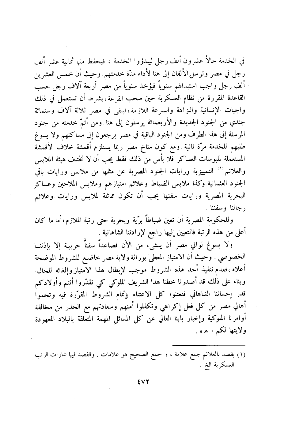 فِي الْخدمَة حَالا عشرُون الف رجل ليبدؤوا الْخدمَة فيحفظ مِنْهَا ثَمَانِيَة عشر الف رجل فِي مصر وَترسل الالفان إِلَى هُنَا لاداء مُدَّة خدمتهم وَحَيْثُ ان خمس الْعشْرين الف رجل وَاجِب استبدالهم سنويا فَيُؤْخَذ سنويا من مصر اربعة آلَاف رجل حسب الْقَاعِدَة المقررة من نظام العسكرية حِين سحب الْقرعَة بِشَرْط ان تسْتَعْمل فِي ذَلِك وَاجِبَات الانسانية والنزاهة والسرعة اللَّازِمَة فَيبقى فِي مصر ثَلَاثَة آلَاف وسِتمِائَة جندي من الْجنُود الجديدة والاربعمائة يرسلون إِلَى هُنَا وَمن اتم خدمته من الْجنُود الْمُرْسلَة إِلَى هَذَا الطّرف وَمن الْجنُود الْبَاقِيَة فِي مصر يرجعُونَ إِلَى مساكنهم وَلَا يسوغ طَلَبهمْ للْخدمَة مرّة ثَانِيَة وَمَعَ كَون مناخ مصر رُبمَا يسْتَلْزم اقمشة خلاف الاقمشة المستعملة لملبوسات العساكر فَلَا باس من ذَلِك فَقَط يجب ان لَا تخْتَلف هَيْئَة الملابس والعلائم التمييزية ورايات الْجنُود المصرية عَن مثلهَا من ملابس ورايات بَاقِي الْجنُود العثمانية وَكَذَا ملابس الضباط وعلائم امتيازهم وملابس الملاحين وعساكر البحرية المصرية ورايات سفنها يجب ان تكون مماثلة لملابس ورايات وعلائم رجالنا وسفننا