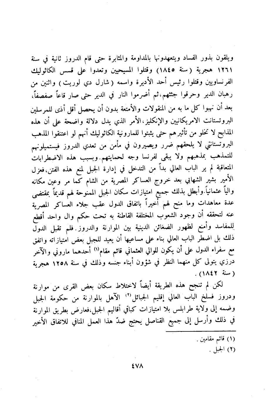 ويلقون بذور الْفساد ويتعهدونها بالمداومة والمثابرة حَتَّى قَامَ الدروز ثَانِيَة فِي سنة 1261 هجرية سنة 1845 وَقتلُوا المسيحيين وتعدوا على قسس الكاثوليك الفرنساويين وَقتلُوا رَئِيس اُحْدُ الاديرة واسْمه شارل دي لوريت واثنين من رُهْبَان الدَّيْر وحرقوا حثثهم ثمَّ اضرموا النَّار فِي الدَّيْر حَتَّى صَار قاعا صفصفا بعد ان نهبوا كل مَا بِهِ من المنقولات والامتعة بِدُونِ ان يحصل اقل اذى للمرسلين البروتستانت الامريكانيين والانكليز الامر الَّذِي يدل دلَالَة وَاضِحَة على ان هَذِه المذابح لَا تَخْلُو من تأثيرهم حَتَّى يثبتوا للمارونية الكاثوليك انهم لَو اعتنقوا الْمَذْهَب البروتستانتي لَا يلحقهم ضَرَر ويصيرون فِي مأمن من تعدِي الدروز فيستميلونهم للتمذهب بمذهبهم وَلَا يبْقى لفرنسا وَجه لحمايتهم وبسبب هَذِه الاضطرابات المتعاقبة لم ير الْبَاب العالي بدا من التدخل فِي ادارة الْجَبَل لمنع هَذِه الْفِتَن فعزل الامير بشير الشهابي بعد خُرُوج العساكر المصرية من الشَّام كَمَا مر وَعين مَكَانَهُ واليا عثمانيا وابطل بذلك جَمِيع امتيازات سكان الْجَبَل الممنوحة لَهُم قَدِيما بِمُقْتَضى عدَّة معاهدات وَمَا منح لَهُم اخيرا بِاتِّفَاق الدول عقب جلاء العساكر المصرية عَنهُ لتحققه ان وجود الشعوب الْمُخْتَلفَة القاطنة بِهِ تَحت حكم وَال وَاحِد اقْطَعْ للمفاسد وامنع لظُهُور الضغائن الدِّينِيَّة بَين الموارنة والدروز فَلم تقبل الدول ذَلِك بل اضْطر الْبَاب العالي بِنَاء على مساعيها ان يُعِيد للجبل بعض امتيازاته وَاتفقَ مَعَ سفراء الدول على ان يكون للوالي العثماني قَائِم مقَام احدهما ماروني وَالْآخر درزي يتَوَلَّى كل مِنْهُمَا النّظر فِي شؤون ابناء جنسه وَذَلِكَ فِي سنة 1258 هجرية سنة 1842