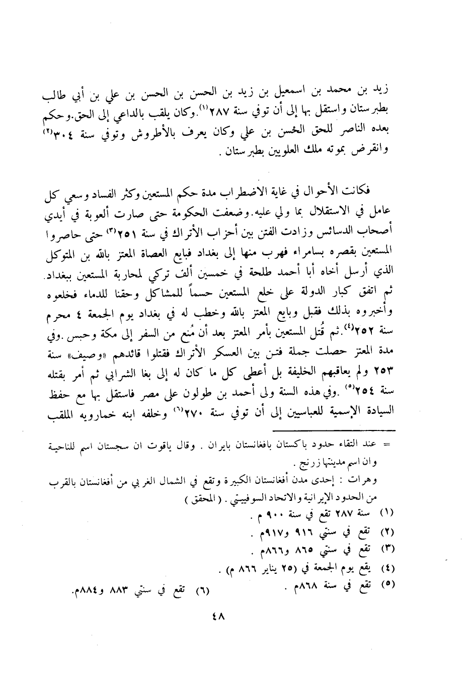 فَكَانَت الاحوال فِي غَايَة الِاضْطِرَاب مُدَّة حكم المستعين وَكثر الْفساد وسعي كل عَامل فِي الِاسْتِقْلَال بِمَا ولي عَلَيْهِ وضعفت الْحُكُومَة حَتَّى صَارَت العوبة فِي ايدي اصحاب الدسائس وزادت الْفِتَن بَين احزاب الاتراك فِي سنة 251 حَتَّى حاصروا المستعين بقصره بسامراء فهرب مِنْهَا إِلَى بَغْدَاد فَبَايع العصاة المعتز بِاللَّه بن المتَوَكل الَّذِي ارسل اخاه ابا احْمَد طَلْحَة فِي خمسين الف تركي لمحاربة المستعين بِبَغْدَاد ثمَّ اتّفق كبار الدولة على خلع المستعين حسما للمشاكل وحقنا للدماء فخلعوه واخبروه بذلك فَقبل وَبَايع المعتز بِاللَّه وخطب لَهُ فِي بَغْدَاد يَوْم الْجُمُعَة 4 محرم سنة 252 ثمَّ قتل المستعين بامر المعتز بعد ان منع من السّفر إِلَى مَكَّة وَحبس وَفِي مُدَّة المعتز حصلت جملَة فتن بَين الْعَسْكَر الاتراك فَقتلُوا قائدهم وصيف سنة 253 وَلم يعاقبهم الْخَلِيفَة بل اعطى كل مَا كَانَ لَهُ إِلَى بغا الشرابي ثمَّ امْر بقتْله سنة 254 وَفِي هَذِه السّنة ولى احْمَد بن طولون على مصر فاستقل بهَا مَعَ حفظ السِّيَادَة الاسمية للعباسيين إِلَى ان توفّي سنة 270 وَخَلفه ابْنه خمارويه الملقب