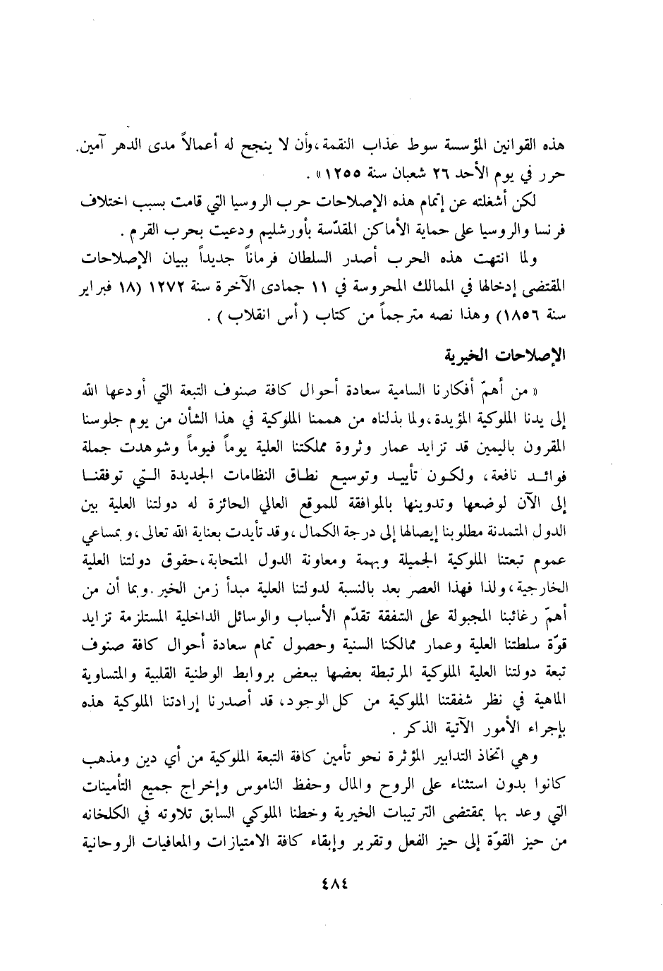 وَلما انْتَهَت هَذِه الْحَرْب اصدر السُّلْطَان فرمانا جَدِيدا بِبَيَان الاصلاحات الْمُقْتَضى ادخالها فِي الممالك المحروسة فِي 11 جُمَادَى الْآخِرَة سنة 1272 18 فبراير سنة 1856 وَهَذَا نَصه مترجما من كتاب اس انقلاب