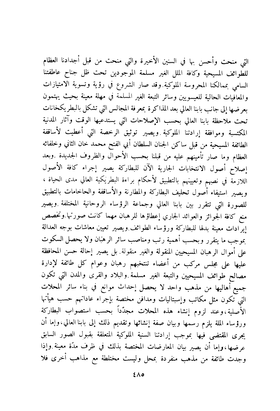 الَّتِي منحت واحسن بهَا فِي السنين الاخيرة وَالَّتِي منحت من قبل اجدادنا الْعِظَام للطوائف المسيحية وكافة الْملَل الْغَيْر مسلمة الْمَوْجُودين تَحت ظلّ جنَاح عاطفتنا السَّامِي بممالكنا المحروسة الملوكية وَقد صَار الشُّرُوع فِي رُؤْيَة وتسوية الامتيازات والمعافيات الحالية للعيسويين وَسَائِر التبعة الْغَيْر الْمسلمَة فِي مهلة مُعينَة بِحَيْثُ يهتمون بعرضها إِلَى جَانب بابنا العالي بعد المذاكرة بِمَعْرِِفَة الْمجَالِس الَّتِي تشكل بالبطريكخانات تَحت مُلَاحظَة بابنا العالي بِحَسب الاصلاحات الَّتِي يستدعيها الْوَقْت وآثار المدنية المكتسبة وموافقة ارادتنا الملوكية وَيصير تَوْثِيق الرُّخْصَة الَّتِي اعطيت لاساقفة الطَّائِفَة المسيحية من قبل سَاكن الْجنان السُّلْطَان ابي الْفَتْح مُحَمَّد خَان الثَّانِي وخلفائه الْعِظَام وَمَا صَار تأمينهم عَلَيْهِ من قبلنَا بِحَسب الاحوال والظروف الجديدة وَبعد اصلاح اصول الانتخابات الْجَارِيَة الْآن للبطاركة يصير اجراء كَافَّة الاصول اللَّازِمَة فِي نصبهم وتعيينهم بالتطبيق لاحكام بَرَاءَة البطريكية العالي مدى الْحَيَاة وَيصير اسْتِيفَاء اصول تَحْلِيف البطاركة والمطارنة والاساقفة والحاخامات بالتطبيق للصورة الَّتِي تتقرر بَين بابنا العالي وَجَمَاعَة الرؤساء الروحانية الْمُخْتَلفَة وَيصير منح كَافَّة الجوائز والعوائد الْجَارِي إعطاؤها للرهبان مهما كَانَت صورتهَا وتخصص إيرادات مُعينَة بدلهَا للبطاركة ورؤساء الطوائف وَيصير تعْيين معاشات بِوَجْه الْعَدَالَة بِمُوجب مَا يَتَقَرَّر وبحسب اهمية رتب ومناصب سَائِر الرهبان وَلَا يحصل السُّكُوت على اموال الرهبان المسيحيين المنقولة والغير منقولة بل يصير احالة حسن الْمُحَافظَة عَلَيْهَا على مجْلِس مركب من اعضاء تنتخبهم رُهْبَان وعوام كل طَائِفَة لادارة مصَالح طوائف المسيحيين والتبعة الْغَيْر مسلمة والبلاد والقرى والمدن الَّتِي تكون جَمِيع اهاليها من مَذْهَب وَاحِد لَا يحصل احداث مَوَانِع فِي بِنَاء سَائِر المحلات الَّتِي تكون مثل مكَاتب واسبتاليات ومدافن مُخْتَصَّة باجراء عاداتهم حسب هيأتها الاصلية وَعند لُزُوم انشاء هَذِه المحلات مجددا بِحَسب استصواب البطاركة ورؤساء الْملَّة يلْزم رسمها وَبَيَان صفة انشائها وَتَقْدِيم ذَلِك إِلَى بابنا العالي واما ان يجرى الْمُقْتَضى فِيهَا بِمُوجب ارادتنا السّنيَّة الملوكية الْمُتَعَلّقَة بِقبُول الصُّور السَّابِق عرضهَا واما ان يصير بَيَان المعارضات المختصة بذلك فِي ظرف مُدَّة مُعينَة وَإِذا وجدت طَائِفَة من مَذْهَب مُنْفَرِدَة بِمحل وَلَيْسَت مختلطة مَعَ مَذَاهِب اخرى فَلَا