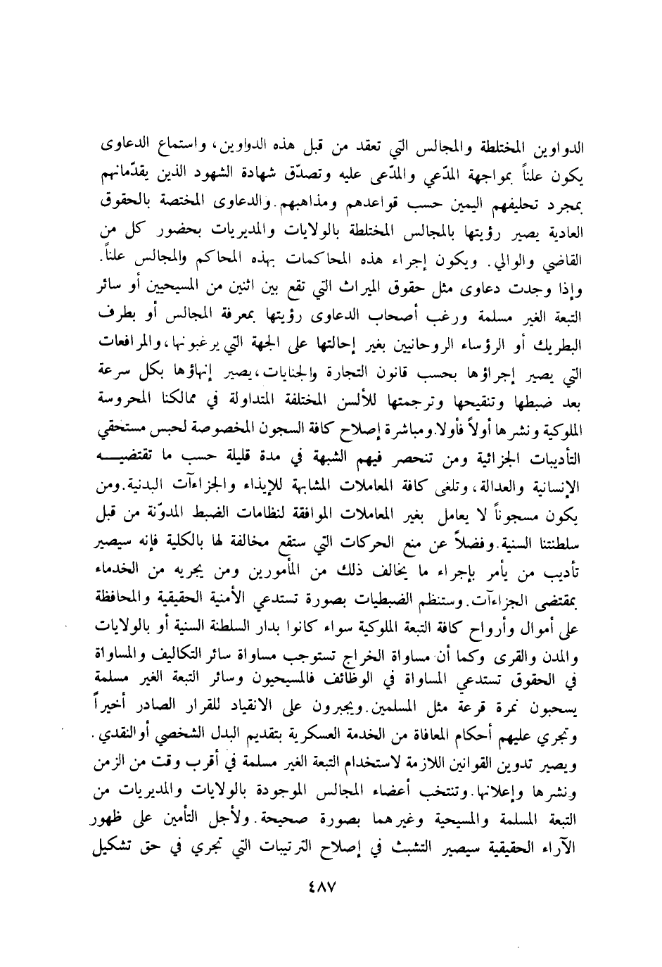المختلطة والمجالس الَّتِي تعقد من قبل هَذِه الدَّوَاوِين واستماع الدَّعَاوَى يكون علنا بمواجهة الْمُدَّعِي وَالْمُدَّعى عَلَيْهِ وَتصدق شَهَادَة الشُّهُود الَّذِي يقدمانهم بِمُجَرَّد تحليفهم الْيَمين حسب قواعدهم ومذاهبهم والدعاوى المختصة بالحقوق العادية يصير رؤيتها بالمجالس المختلطة بالولايات والمديريات بِحُضُور كل من القَاضِي والوالي وَيكون اجراء هَذِه المحاكمات بِهَذِهِ المحاكم والمجالس علنا وَإِذا وجدت دعاوى مثل حُقُوق الْمِيرَاث الَّتِي تقع بَين اثْنَيْنِ من المسيحيين اَوْ سَائِر التبعة الْغَيْر مسلمة وَرغب اصحاب الدَّعَاوَى رؤيتها بِمَعْرِِفَة الْمجَالِس اَوْ بِطرف البطريك اَوْ الرؤساء الروحانيين بِغَيْر احالتها على الْجِهَة الَّتِي يرغبونها والمرافعات الَّتِي يصير اجراؤها بِحَسب قانون التِّجَارَة والجنايات يصير انهاؤها بِكُل سرعَة بعد ضَبطهَا وتنقيحها وترجمتها للالسن الْمُخْتَلفَة المتداولة فِي ممالكنا المحروسة الملوكية ونشرها اولا فاولا ومباشرة اصلاح كَافَّة السجون الْمَخْصُوصَة لحبس مستحقي التأديبات الجزائية وَمن تَنْحَصِر فيهم الشُّبْهَة فِي مُدَّة قَليلَة حسب مَا تَقْتَضِيه الانسانية وَالْعَدَالَة وتلغى كَافَّة الْمُعَامَلَات المشابهة للايذاء والجزاءآت الْبَدَنِيَّة وَمن يكون مسجونا لَا يُعَامل بِغَيْر الْمُعَامَلَات الْمُوَافقَة لنظامات الضَّبْط الْمُدَوَّنَة من قبل سلطنتنا السّنيَّة وفضلا عَن منع الحركات الَّتِي ستقع مُخَالفَة لَهَا بِالْكُلِّيَّةِ فَإِنَّهُ سيصير تَأْدِيب من يامر باجراء مَا يُخَالف ذَلِك من المأمورين وَمن يجريه من الخدماء بِمُقْتَضى الجزاءآت وستنظم الضبطيات بِصُورَة تستدعي الامنية الْحَقِيقِيَّة والمحافظة عل اموال وارواح كَافَّة التّبعِيَّة الملوكية سَوَاء كَانُوا بدار السلطنة السّنيَّة اَوْ بالولايات والمدن والقرى وكما ان مُسَاوَاة الْخراج تستوجب مُسَاوَاة سَائِر التكاليف والمساواة فِي الْحُقُوق تستدعي الْمُسَاوَاة فِي الْوَظَائِف فالمسيحيون وَسَائِر التبعة الْغَيْر مسلمة يسْحَبُونَ نمرة قرعَة مثل الْمُسلمين ويجبرون على الانقياد للقرار الصَّادِر اخيرا وتجري عَلَيْهِم احكام المعافاة من الْخدمَة العسكرية بِتَقْدِيم الْبَدَل الشخصي اَوْ النقدي وَيصير تدوين القوانين اللَّازِمَة لاستخدام التبعة الْغَيْر مسلمة فِي اقْربْ وَقت من الزَّمن ونشرها واعلانها وتنتخب اعضاء الْمجَالِس الْمَوْجُودَة بالولايات والمديريات من التبعة الْمسلمَة والمسيحية وَغَيرهمَا بِصُورَة صَحِيحَة ولاجل التَّأْمِين على ظُهُور الآراء الْحَقِيقِيَّة سيصير التشبث فِي اصلاح الترتيبات الَّتِي تجْرِي فِي حق تشكيل