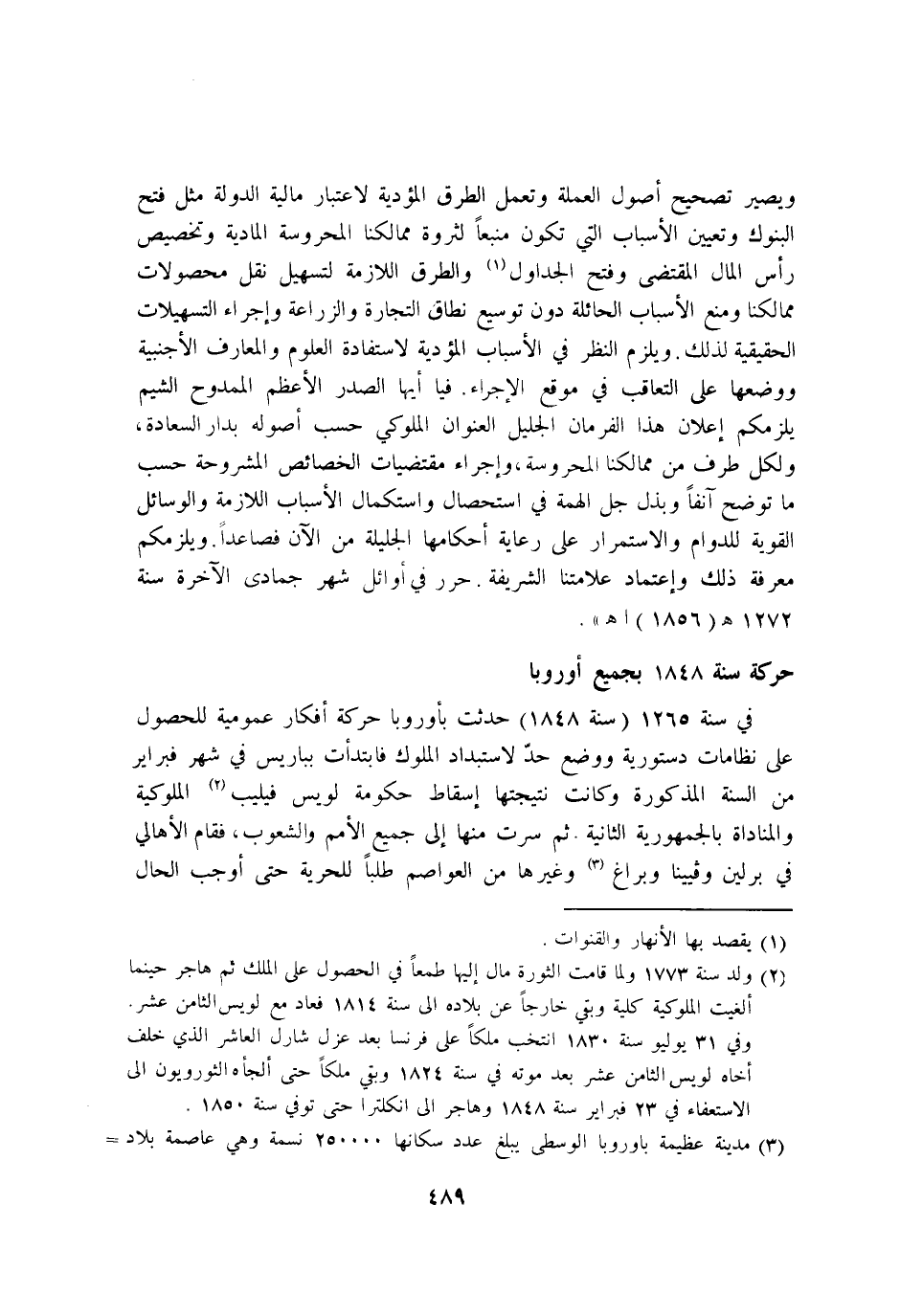 فِي سنة 1265 سنة 1848 حدثت باوروبا حَرَكَة افكار عمومية للحصول على نظامات دستورية وَوضع حد لاستبداد الْمُلُوك فابتدأت بباريس فِي شهر فبراير من السّنة الْمَذْكُورَة وَكَانَت نتيجتها اسقاط حُكُومَة لويس فيليب الملوكية والمناداة بالجمهورية الثَّانِيَة ثمَّ سرت مِنْهَا إِلَى جَمِيع الامم والشعوب فَقَامَ الاهالي فِي برلين وفيينا وبراغ وَغَيرهَا من العواصم طلبا للحرية حَتَّى اوجب الْحَال