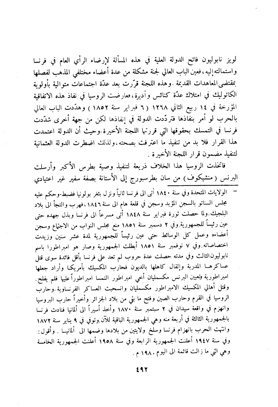 لويز نابوليون فاتح الدولة الْعلية فِي هَذِه الْمَسْأَلَة لارضاء الرَّأْي الْعَام فِي فرنسا واستمالته اليه فعين الْبَاب العالي لجنة مشكلة من عدَّة اعضاء مختلفي الْمَذْهَب لفصلها بِمُقْتَضى المعاهدات الْقَدِيمَة وَهَذِه اللجنة قررت بعد عدَّة اجتماعات مُتَوَالِيَة باولوية الكاتوليك فِي امتلاك عدَّة كنائس واديرة فعارضت الروسيا فِي نَفاذ هَذِه الاتفاقية المؤرخة فِي 14 ربيع الثَّانِي 1268 6 فبراير سنة 1852 وهددت الْبَاب العالي بِالْحَرْبِ لَو امْر بنفاذها فترددت الدولة فِي انفاذها لَكِن من جِهَة اخرى شددت فرنسا فِي التَّمَسُّك بحقوقها الَّتِي قررتها اللجنة الاخيرة وَحَيْثُ ان الدولة اعتمدت هَذَا الْقَرار فَلَا بُد من تَنْفِيذ مَا اعْترفت بِصِحَّتِهِ وَلذَلِك اضطرت الدولة العثمانية لتنفيذ مَضْمُون قَرَار اللجنة الاخيرة