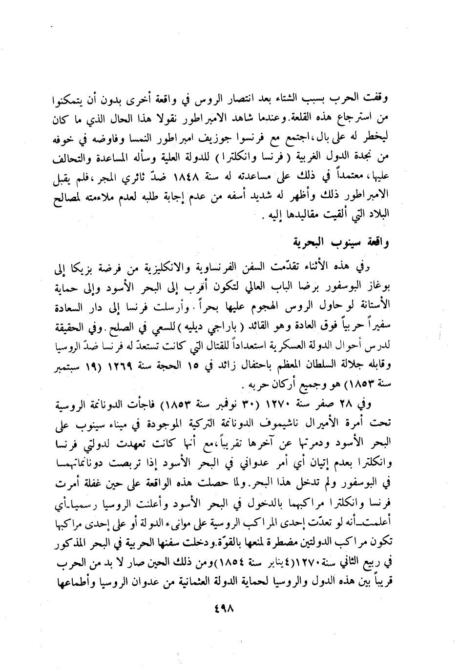 وَفِي 28 صفر سنة 1270 30 نوفمبر سنة 1853 فاجأت الدونانمة الروسية تَحت امرة الاميرال ناشيموف الدونانمة التركية الْمَوْجُودَة فِي ميناء سينوب على الْبَحْر الاسود ودمرتها عَن آخرهَا تَقْرِيبًا مَعَ انها كَانَت تعهدت لدولتي فرنسا وانكلترا بِعَدَمِ اتيان أَي امْر عدواني فِي الْبَحْر الاسود إِذا تربصت دونانماتهما فِي البوسفور وَلم تدخل هَذَا الْبَحْر وَلما حصلت هَذِه الْوَاقِعَة على حِين غَفلَة امرت فرنسا وانكلترا مراكبهما بِالدُّخُولِ فِي الْبَحْر الاسود واعلنت الروسيا رسميا أَي اعلمت انه لَو تعدت احدى المراكب الروسية على موانئ الدولة اَوْ على احدى مراكبها تكون مراكب الدولتين مضطرة لمنعها بِالْقُوَّةِ وَدخلت سفنها الحربية فِي الْبَحْر الْمَذْكُور فِي ربيع الثَّانِي سنة 1270 4 يناير سنة 1854 وَمن ذَلِك الْحِين صَار لَا بُد من الْحَرْب قَرِيبا بَين هَذِه الدول والروسيا لحماية الدولة العثمانية من عدوان الروسيا واطماعها