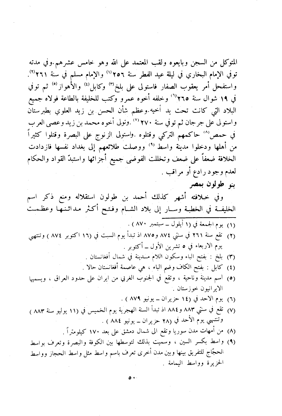 المتَوَكل من السجْن وَبَايَعُوهُ ولقب الْمُعْتَمد على الله وَهُوَ خَامِس عشرهم وَفِي مدَّته توفّي الامام البُخَارِيّ فِي لَيْلَة عيد الْفطر سنة 256 والامام مُسلم فِي سنة 261 واستفحل امْر يَعْقُوب الصفار فاستولى على بَلخ وكابل والاهواز ثمَّ توفّي فِي 19 شَوَّال سنة 265 وَخَلفه اخوه عَمْرو وَكتب للخليفة بِالطَّاعَةِ فولاه جَمِيع الْبِلَاد الَّتِي كَانَت تَحت يَد اخيه وَعظم شَأْن الْحسن بن زيد الْعلوِي بطبرستان وَاسْتولى على جرجان ثمَّ توفّي سنة 270 وَتَوَلَّى اخوه مُحَمَّد بن زيد وَعصى الْعَرَب فِي حمص حاكمهم التركي وقتلوه وَاسْتولى الزنوج على الْبَصْرَة وَقتلُوا كثيرا من اهلها ودخلوا مَدِينَة وَاسِط ووصلت طلائعهم إِلَى بَغْدَاد نَفسهَا فازدادت الْخلَافَة ضعفا على ضعف وتخللت الفوضى جَمِيع اجزائها واستبد القواد والحكام لعدم وجود رادع اَوْ مراقب