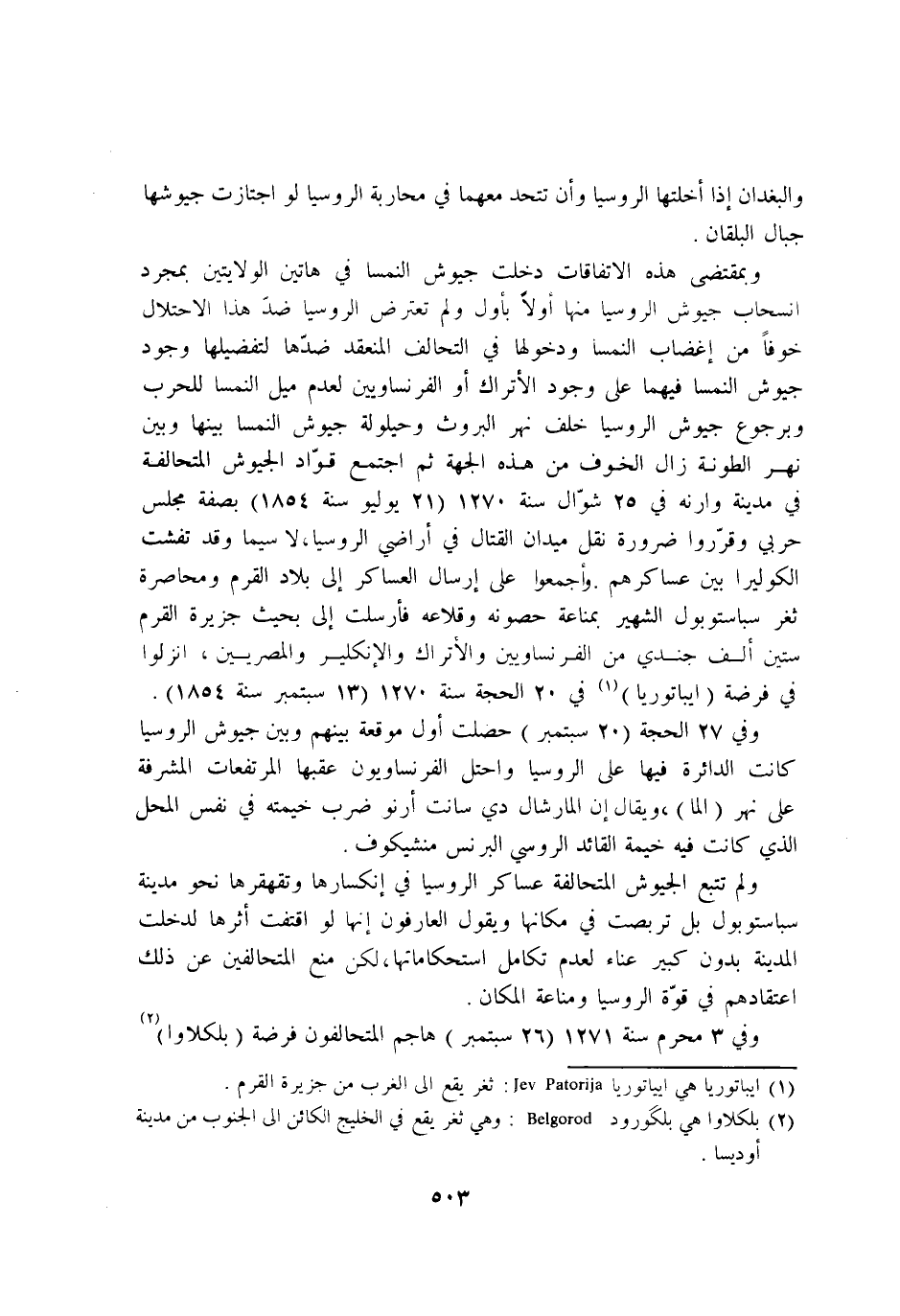 وبمقتضى هَذِه الاتفاقات دخلت جيوش النمسا فِي هَاتين الولايتين بِمُجَرَّد انسحاب جيوش الروسيا مِنْهَا اولا باول وَلم تعترض الروسيا ضد هَذَا الاحتلال خوفًا من اغضاب النمسا ودخولها فِي التَّحَالُف المنعقد ضدها لتفضيلها وجود جيوش النمسا فيهمَا على وجود الاتراك اَوْ الفرنساويين لعدم ميل النمسا للحرب وبرجوع جيوش الروسيا خلف نهر البروث وحيلولة جيوش النمسا بَينهَا وَبَين نهر الطونة زَالَ الْخَوْف من هَذِه الْجِهَة ثمَّ اجْتمع قواد الجيوش المتحالفة فِي مَدِينَة وارنه فِي 25 شَوَّال سنة 1270 21 يوليو سنة 1854 بِصفة مجْلِس حَرْبِيّ وقرروا ضَرُورَة نقل ميدان الْقِتَال فِي اراضي الروسيا لَا سِيمَا وَقد تفشت الكوليرا بَين عساكرهم واجمعوا على ارسال العساكر إِلَى بِلَاد القرم ومحاصرة ثغر سباستوبول الشهير بمناعة حصونه وقلاعه فارسلت إِلَى بِحَيْثُ جَزِيرَة القرم سِتِّينَ الف جندي من الفرنساويين والاتراك والانكليز والمصريين انزلوا فِي فرضة ايباتوريا فِي 20 الْحجَّة سنة 1270 13 سبتمبر سنة 1854