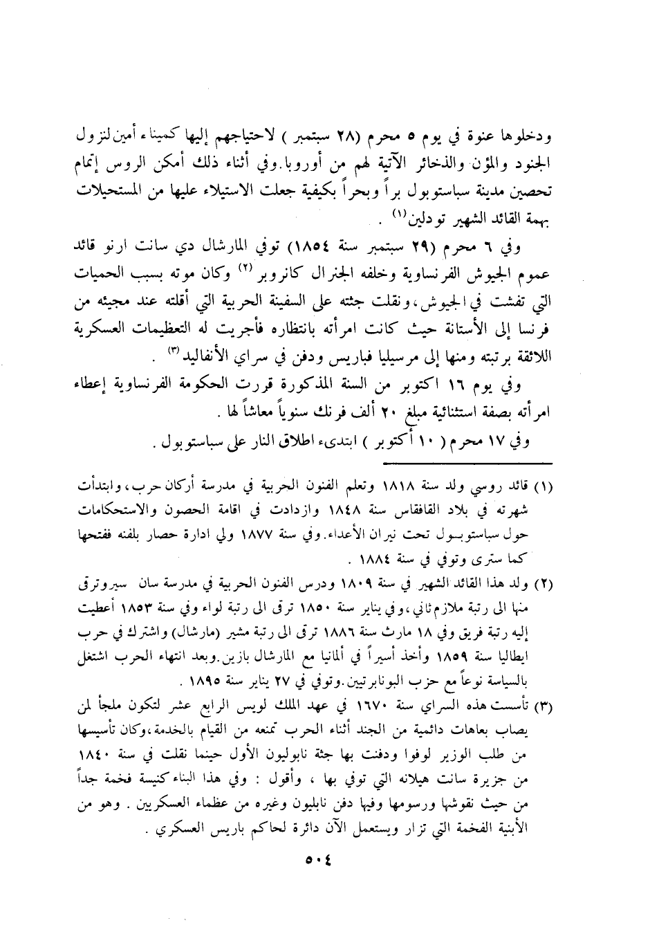 وَفِي 6 محرم 29 سبتمبر سنة 1854 توفّي المارشال دي سانت ارنو قَائِد عُمُوم الجيوش الفرنساوية وَخَلفه الجنرال كانروبر وَكَانَ مَوته بِسَبَب الحميات الَّتِي تفشت فِي الجيوش ونقلت جثته على السَّفِينَة الحربية الَّتِي اقلته عِنْد مَجِيئه من فرنسا إِلَى الاستانة حَيْثُ كَانَت امْرَأَته بانتظاره فاجريت لَهُ التعظيمات العسكرية اللائقة برتبته وَمِنْهَا إِلَى مرسيليا فباريس وَدفن فِي سراي الانفاليد