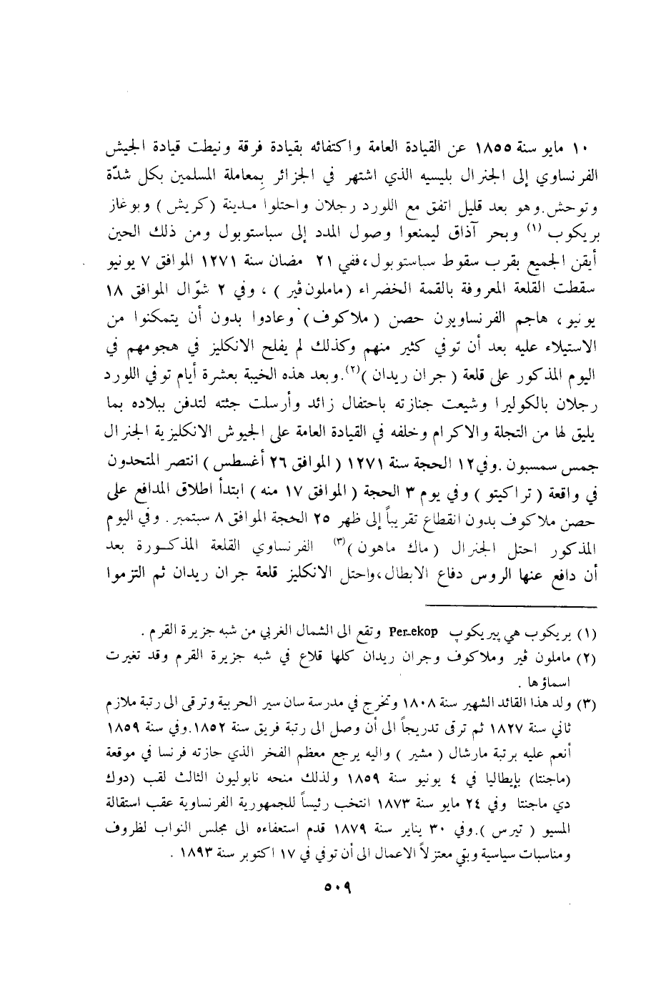 10 - مايو سنة 1855 عَن القيادة الْعَامَّة واكتفائه بقيادة فرقة ونيطت قيادة الْجَيْش الفرنساوي إِلَى الجنرال بليسيه الَّذِي اشْتهر فِي الجزائر بمعاملة الْمُسلمين بِكُل شدَّة وتوحش وَهُوَ بعد قَلِيل اتّفق مَعَ اللورد رجلَانِ واحتلوا مَدِينَة كريش وبوغاز بريكوب وبحر آذاق ليمنعوا وُصُول المدد إِلَى سباستوبول وَمن ذَلِك الْحِين ايقن الْجَمِيع بِقرب سُقُوط سباستوبول فَفِي 21 رَمَضَان سنة 1271 الْمُوَافق 7 يونيو سَقَطت القلعة الْمَعْرُوفَة بالقمة الخضراء ماملون فير وَفِي 2 شَوَّال الْمُوَافق 18 يونيو هاجم الفرنساويون حصن ملاكوف وعادوا بِدُونِ ان يتمكنوا من الِاسْتِيلَاء عَلَيْهِ بعد ان توفّي كثير مِنْهُم وَكَذَلِكَ لم يفلح الانكليز فِي هجومهم فِي الْيَوْم الْمَذْكُور على قلعة جران ريدان وَبعد هَذِه الخيبة بِعشْرَة ايام توفّي اللورد رجلَانِ بالكوليرا وشيعت جنَازَته باحتفال زَائِد وارسلت جثته لتدفن ببلاده بِمَا يَلِيق لَهَا من التجلة والاكرام وَخَلفه فِي القيادة الْعَامَّة على الجيوش الانكليزية الجنرال جمس سمسبون وَفِي 12 الْحجَّة سنة 1271 الْمُوَافق 26 اغسطس انتصر المتحدون فِي وَاقعَة تراكيتو وَفِي يَوْم 3 الْحجَّة الْمُوَافق 17 مِنْهُ ابْتَدَأَ اطلاق المدافع على حصن ملاكوف بِدُونِ انْقِطَاع تَقْرِيبًا إِلَى ظهر 25 الْحجَّة الْمُوَافق 8 سبتمبر وَفِي الْيَوْم الْمَذْكُور احتل الجنرال ماك ماهون الفرنساوي القلعة الْمَذْكُورَة بعد ان دَافع عَنْهَا الروس دفاع الابطال واحتل الانكليز قلعة جران ريدان ثمَّ التزموا