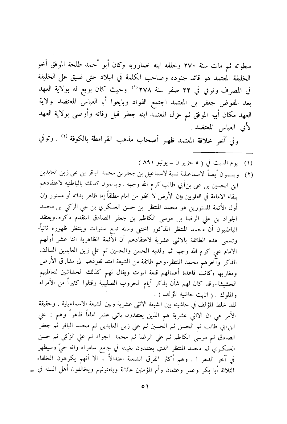 وَفِي آخر خلَافَة الْمُعْتَمد ظهر اصحاب مَذْهَب القرامطة بِالْكُوفَةِ وَتُوفِّي