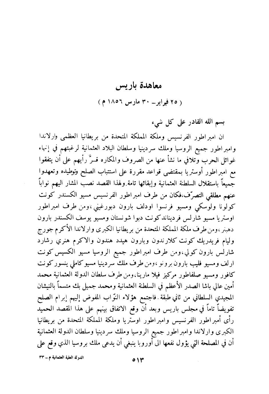 ان امبراطور الفرنسيس وملكة المملكة المتحدة من بريطانيا الْعُظْمَى وارلاندا وامبراطور جَمِيع الروسيا وَملك سردينيا وسلطان الْبِلَاد العثماني لرغبتهم فِي انهاء غوائل الْحَرْب وتلافي مَا نَشأ عَنْهَا من الصروف والمكاره قر رَأْيهمْ على ان يتفقوا مَعَ امبراطور اوستريا بِمُقْتَضى قَوَاعِد مقررة على استتباب الصُّلْح وتوطيده وتعهدوا جَمِيعًا باستقلال السلطنة العثمانية وابقائها تَامَّة وَلِهَذَا الْقَصْد نصب الْمشَار اليهم نوابا عَنْهُم مطلقي التَّصَرُّف فَكَانَ من طرف امبراطور الفرنسيس مسيو الكسندر كونت كولونا ولوسكي ومسيو فرانسوا اودلف بارون دبورغيني وَمن طرف امبراطور اوستريا مسيو شارلس فرديناند كونت دبوا شونستان ومسيو يُوسُف الكسندر بارون دهبنر وَمن طرف ملكة المملكة المتحدة من بريطانيا الْكُبْرَى وارلاندا الاكرم جورج وليام فريدريك كونت كلارندون وبارون هيدد هندون والاكرم هنري رشارد شارلس بارون كولي وَمن طرف امبراطور جَمِيع الروسيا مسيو الكسيس كونت ارلف ومسيو فليب بارون برونو وَمن طرف ملك سردينيا مسيو كاملي ينسور كونت كافور ومسيو صلفاطور مركيز فيلا مارينا وَمن طرف سُلْطَان الدولة العثمانية مُحَمَّد امين عالي باشا الصَّدْر الاعظم فِي السلطنة العثمانية وَمُحَمّد جميل بك متسما بالنيشان المجيدي السلطاني من ثَانِي طبقَة فَاجْتمع هَؤُلَاءِ النواب الْمُفَوض اليهم ابرام الصُّلْح تفويضا تَاما فِي مجْلِس باريس وَبعد ان وَقع الِاتِّفَاق بَينهم على هَذَا الْمَقْصد الحميد رأى امبراطور الفرنسيس وامبراطور اوستريا وملكة المملكة المتحدة من بريطانيا الْكُبْرَى وارلاندا وامبراطور جَمِيع الروسيا وَملك سردينيا وسلطان الدولة العثمانية ان فِي الْمصلحَة الَّتِي يؤول نَفعهَا إِلَى اوروبا يَنْبَغِي ان يدعى ملك بروسيا الَّذِي وَقع على معاهدة