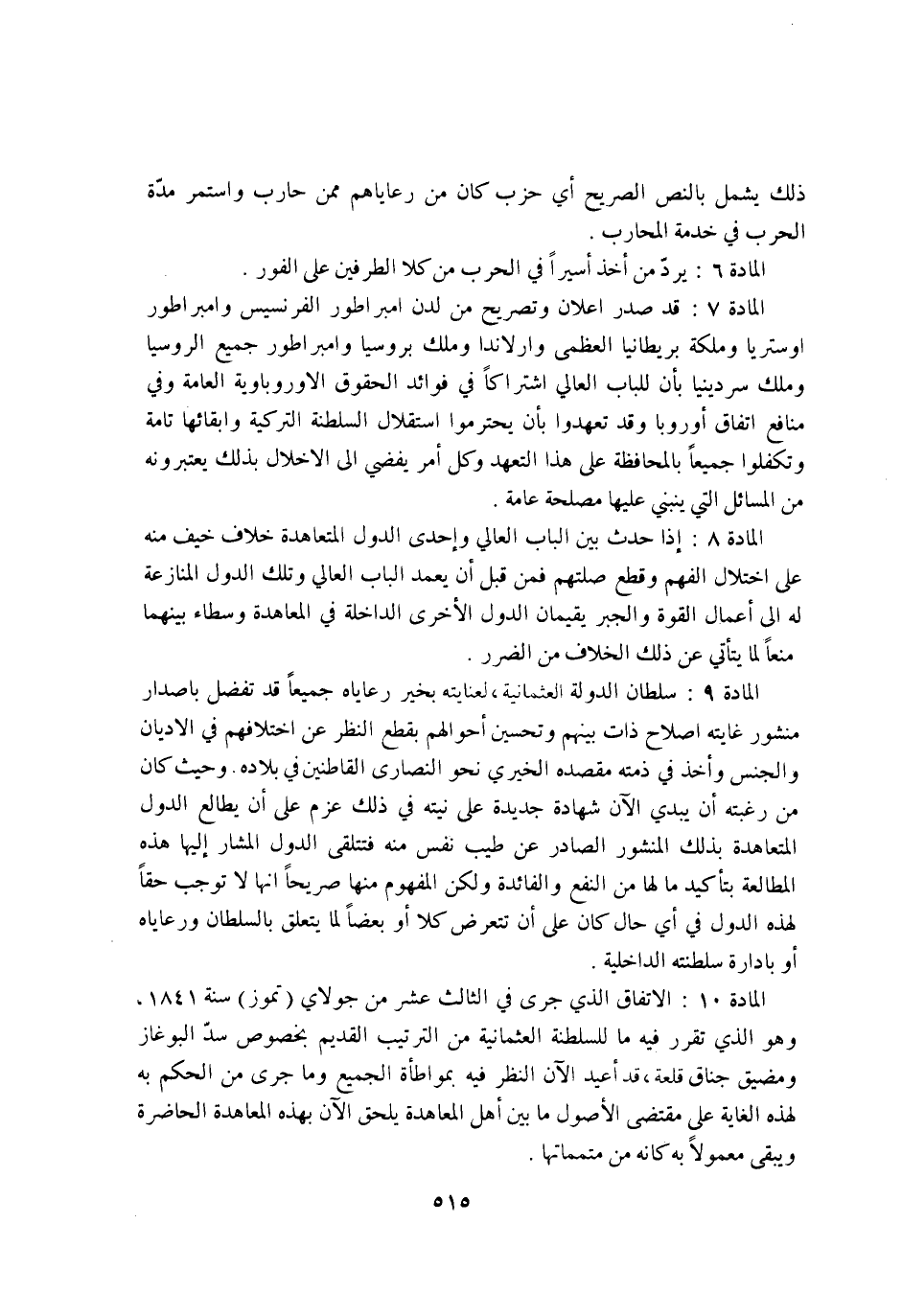 الْمَادَّة 9 سُلْطَان الدولة العثمانية لعنايته بِخَير رعاياه جَمِيعًا قد تفضل باصدار منشور غَايَته اصلاح ذَات بَينهم وتحسين احوالهم بِقطع النّظر عَن اخْتلَافهمْ فِي الاديان وَالْجِنْس واخذ فِي ذمَّته مقْصده الخيري نَحْو النَّصَارَى القاطنين فِي بِلَاده وَحَيْثُ كَانَ من رغبته ان يُبْدِي الْآن شَهَادَة جَدِيدَة على نِيَّته فِي ذَلِك عزم على ان يطالع الدول المتعاهدة بذلك المنشور الصَّادِر عَن طيب نفس مِنْهُ فتتلقى الدولة الْمشَار اليها هَذِه المطالعة بتأكيد مَا لَهَا من النَّفْع والفائدة وَلَكِن الْمَفْهُوم مِنْهَا صَرِيحًا انها لَا توجب حَقًا لهَذِهِ الدولة فِي أَي حَال كَانَ على ان تتعرض كلا اَوْ بَعْضًا لما يتَعَلَّق بالسلطان ورعاياه اَوْ بادارة سلطنته الداخلية الْمَادَّة 10 الِاتِّفَاق الَّذِي جرى فِي الثَّالِث عشر من جولاي تموز سنة 1841 وَهُوَ الَّذِي تقرر فِيهِ مَا للسلطنة العثمانية من التَّرْتِيب الْقَدِيم بِخُصُوص سد البوغاز ومضيق جناق قلعة قد اعيد الْآن النّظر فِيهِ بمواطأة الْجَمِيع وَمَا جرى من الحكم بِهِ لهَذِهِ الْغَايَة على مُقْتَضى الاصول مَا بَين اهل المعاهدة يلْحق الْآن بِهَذِهِ المعاهدة الْحَاضِرَة وَيبقى مَعْمُولا بِهِ كانه من متمماتها