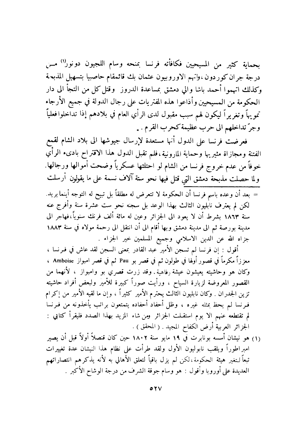 بحماية كثير من المسيحيين فكافأته فرنسا بمنحه وسام اللجيون دونور من دَرَجَة جران كوردون واتهم الاوروبيون عُثْمَان بك قائمقام حاصبيا بتسهيل المذبحة وَكَذَلِكَ اتهموا احْمَد باشا وَالِي دمشق بمساعدة الدروز وَقتل كل من التجأ إِلَى دَار الْحُكُومَة من المسيحيين واذاعوا هَذِه المفتريات على رجال الدولة فِي جَمِيع الارجاء تمويها وتغريرا ليَكُون لَهُم سَبَب مَقْبُول لَدَى الرَّأْي الْعَام فِي بِلَادهمْ إِذا تداخلوا فعليا وجر تداخلهم إِلَى حَرْب عَظِيمَة كحرب القرم