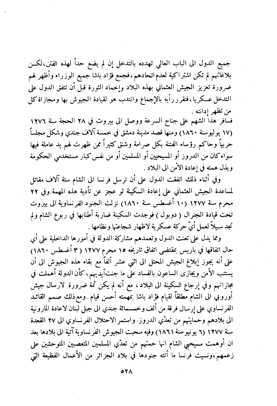 وَمِمَّا يدل على تعنت الدول وتعمدهم مُشَاركَة الدولة فِي امورها الداخلية على أَي حَال اتفاقها فِي باريس بِمُقْتَضى اتِّفَاق تَارِيخه 15 محرم 1277 3 اغسطس 1860 على انه يجوز ابلاغ الْجَيْش المحتل إِلَى اثْنَي عشر الْفَا مَعَ بَقَاء هَذِه الجيوش إِلَى ان يستتب الامن ويجازى الساعون بِالْفَسَادِ على مَا جنت ايديهم كَأَن الدولة اهملت فِي مجازاتهم وَفِي ارجاع السكينَة إِلَى الْبِلَاد مَعَ انه لم يكن ثمَّة ضَرُورَة لارسال جَيش اوروبي إِلَى الشَّام مُطلقًا لقِيَام فؤاد باشا بمهمته احسن قيام وَمَعَ ذَلِك صمم الْقَائِد الفرنسا وي على ارسال فرقة من الف وَخَمْسمِائة جندي إِلَى جبل لبنان لاعادة المارونية إِلَى بِلَادهمْ وحمايتهم من تعدِي الدروز وَاسْتمرّ الاحتلال الفرنساوي إِلَى 27 الْقعدَة سنة 1277 6 يونيو سنة 1861 وَفِيه سحبت الجيوش الفرنساوية آتِيَة إِلَى بلادها بعد ان اوهمت مسيحيي الشَّام انها حمتهم من تعدِي الْمُسلمين المتعصبين المتوحشين على زعمهم ونسيت فرنسا مَا اتته جنودها فِي بِلَاد الجزائر من الاعمال الفظيعة الَّتِي