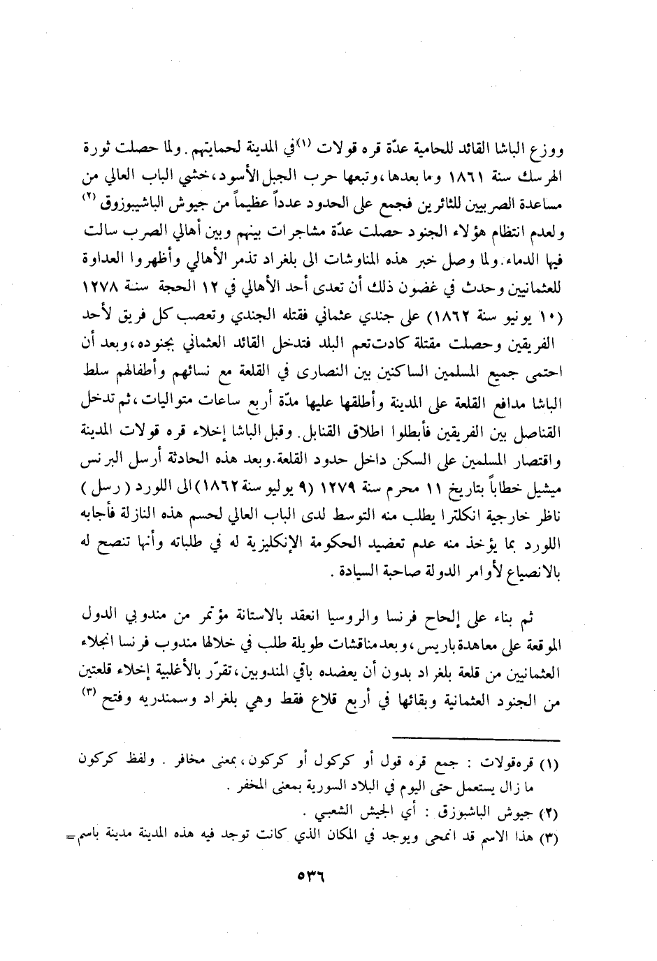 ووزع الباشا الْقَائِد للحامية عدَّة قره قولات فِي الْمَدِينَة لحمايتهم وَلما حصلت ثورة الهرسك سنة 1861 ومابعدها وتبعها حَرْب الْجَبَل الاسود خشِي الْبَاب العالي من مساعدة الصربيين للثائرين فَجمع على الْحُدُود عددا عَظِيما من جيوش الباشيبوزوق وَلعدم انتظام هَؤُلَاءِ الْجنُود حصلت عدَّة مشاجرات بَينهم وَبَين اهالي الصرب سَالَتْ فِيهَا الدِّمَاء وَلما وصل خبر هَذِه المناوشات إِلَى بلغراد تذمر الاهالي واظهروا الْعَدَاوَة للعثمانيين وَحدث فِي غُضُون ذَلِك ان تعدى اُحْدُ الاهالي فِي 12 الْحجَّة سنة 1278 10 يونيو سنة 1862 على جندي عثماني فَقتله الجندي وتعصب كل فريق لَاحَدَّ الْفَرِيقَيْنِ وحصلت مقتلة كَادَت تعم الْبَلَد فَتدخل الْقَائِد العثماني بجُنُوده وَبعد ان احتمى جَمِيع الْمُسلمين الساكنين بَين النَّصَارَى فِي القلعة مَعَ نِسَائِهِم واطفالهم سلط الباشا مدافع القلعة على الْمَدِينَة واطلقها عَلَيْهَا مُدَّة ارْبَعْ سَاعَات مُتَوَالِيَات ثمَّ تدخل القناصل بَين الْفَرِيقَيْنِ فابطلوا اطلاق القنابل وَقبل الباشا اخلاء قره قولات الْمَدِينَة واقتصار الْمُسلمين على السكن دَاخل حُدُود القلعة وَبعد هَذِه الْحَادِثَة ارسل الْبُرْنُس ميشيل خطابا بتاريخ 11 محرم سنة 1279 9 يوليو سنة 1862 إِلَى اللورد رسل نَاظر خارجية انكلترا يطْلب مِنْهُ التَّوَسُّط لَدَى الْبَاب العالي لحسم هَذِه النَّازِلَة فاجابه اللورد بِمَا يُؤْخَذ مِنْهُ عدم تعضيد الْحُكُومَة الانكليزية لَهُ فِي طلباته وانها تنصح لَهُ بالانصياع لاوامر الدولة صَاحِبَة السِّيَادَة