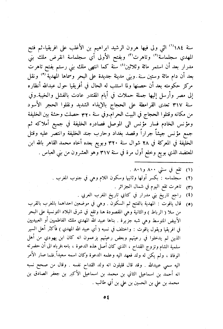 سنة 184 الَّتِي ولى فِيهَا هرون الرشيد ابراهيم بن الاغلب على افريقيا ثمَّ فتح الْمهْدي سجلماسة وتاهرت وبفتح الاولى أَي سجلماسة انقرض ملك بني مدرار بعد ان اسْتمرّ مائَة وَثَلَاثِينَ سنة كَمَا انْتهى ملك بني رستم بِفَتْح تاهرت بعد ان دَامَ مائَة وَسِتِّينَ سنة وَبنى مَدِينَة جَدِيدَة على الْبَحْر وسماها المهدية وَنقل مَرْكَز حكومته بعد ان حصنها وَلما استتب لَهُ الْحَال فِي افريقيا حول عبد الله انظاره إِلَى مصر وارسل اليها جملَة حملات فِي ايام المقتدر عَادَتْ بالفشل والخيبة وَفِي سنة 317 تعدى القرامطة على الْحجَّاج بالايذاء الشَّديد ونقلوا الْحجر الاسود من مَكَانَهُ وَقتلُوا الْحجَّاج فِي الْبَيْت الْحَرَام وَفِي سنة 320 حصلت وَحْشَة بَين الْخَلِيفَة ومؤنس الْخَادِم فَسَار مؤنس إِلَى الْموصل فصادره الْخَلِيفَة فِي جَمِيع املاكه ثمَّ جمع مؤنس جَيْشًا جرارا وَقصد بَغْدَاد وَحَارب جند الْخَلِيفَة وانتصر عَلَيْهِ وَقتل الْخَلِيفَة فِي المعركة فِي 28 شَوَّال سنة 320 وبويع بعده اخاه مُحَمَّد القاهر بِاللَّه ابْن المعتضد الَّذِي بُويِعَ وخلع اول مرّة فِي سنة 317 وَهُوَ الْعشْرُونَ من بني الْعَبَّاس