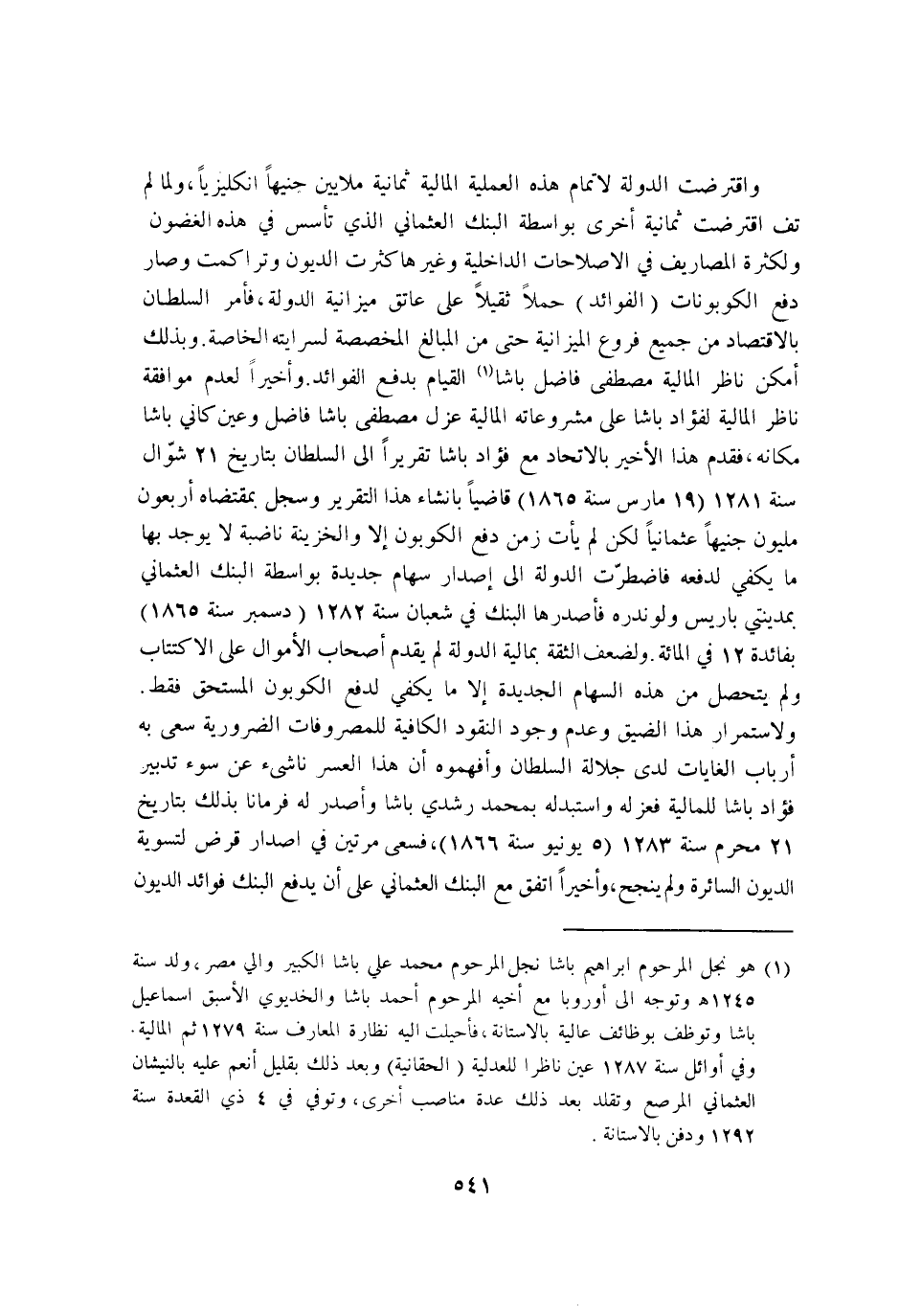 واقترضت الدولة لاتمام هَذِه العملية الْمَالِيَّة ثَمَانِيَة ملايين جنيها انكليزيا وَلما لم تف اقترضت ثَمَانِيَة اخرى بِوَاسِطَة البنك العثماني الَّذِي تأسس فِي هَذِه الغضون ولكثرة المصاريف فِي الاصلاحات الداخلية وَغَيرهَا كثرت الدُّيُون وتراكمت وَصَارَ دفع الكوبونات الْفَوَائِد حملا ثقيلا على عاتق ميزانية الدولة فامر السُّلْطَان بالاقتصاد من جَمِيع فروع الميزانية حَتَّى من المبالغ المخصصة لسرايته الْخَاصَّة وَبِذَلِك امكن نَاظر الْمَالِيَّة مصطفى فَاضل باشا الْقيام بِدفع الْفَوَائِد واخيرا لعدم مُوَافقَة نَاظر الْمَالِيَّة لفؤاد باشا على مشروعاته الْمَالِيَّة عزل مصطفى باشا فَاضل وَعين كاني باشا مَكَانَهُ فَقدم هَذَا الاخير بالاتحاد مَعَ فؤاد باشا تقريرا إِلَى السُّلْطَان بتاريخ 21 شَوَّال سنة 1281 19 مارس سنة 1865 قَاضِيا بانشاء هَذَا التَّقْرِير وسجل بِمُقْتَضَاهُ اربعون مليون جنيها عثمانيا لَكِن لم يَأْتِ زمن دفع الكوبون الا والخزينة ناضبة لَا يُوجد بهَا مَا يَكْفِي لدفعه فاضطرت الدولة إِلَى اصدار سِهَام جَدِيدَة بِوَاسِطَة البنك العثماني بمدينتي باريس ولوندره فاصدرها البنك فِي شعْبَان سنة 1282 دسمبر سنة 1865 بفائدة 12 فِي الْمِائَة ولضعف الثِّقَة بمالية الدولة لم يقدم اصحاب الاموال على الاكتتاب وَلم يتَحَصَّل من هَذِه السِّهَام الجديدة الا مايكفي لدفع الكوبون الْمُسْتَحق فَقَط ولاستمرار هَذَا الضّيق وَعدم وجود النُّقُود الكافية للمصروفات الضرورية سعى بِهِ ارباب الغايات لَدَى جلالة السُّلْطَان وافهموه ان هَذَا الْعسر نَاشِئ عَن سوء تَدْبِير فؤاد باشا للمالية فَعَزله واستبدله بِمُحَمد رشدي باشا واصدر لَهُ فرمانا بذل بتاريخ 21 محرم سنة 1283 5 يونيو سنة 1866 فسعى مرَّتَيْنِ فِي اصدار قرض لتسوية الدُّيُون السائرة وَلم ينجح واخيرا اتّفق مَعَ البنك العثماني على ان يدْفع البنك فَوَائِد الدُّيُون