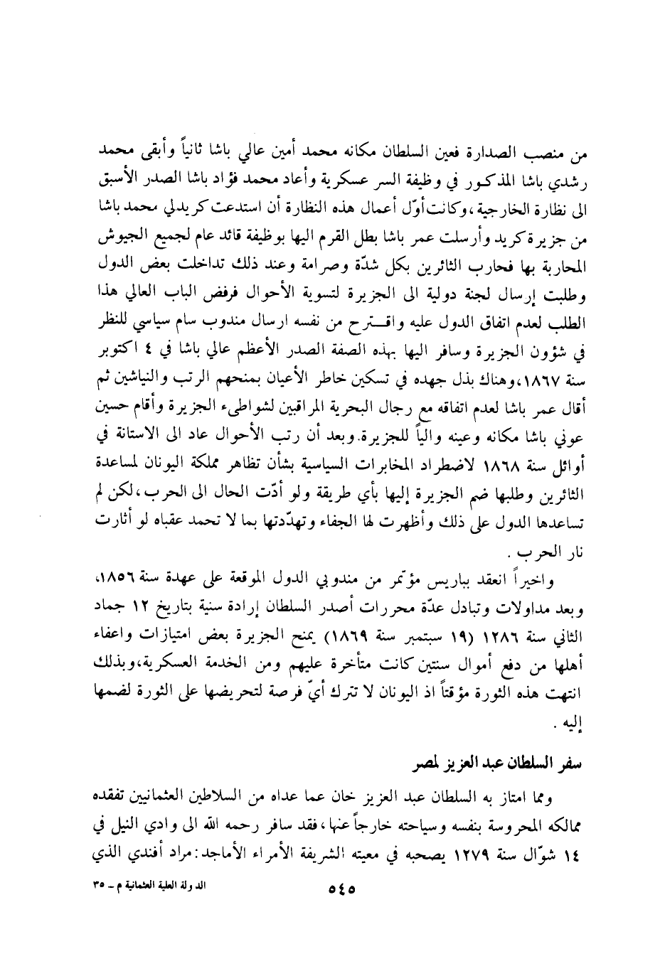 من منصب الصدارة فعين السُّلْطَان مَكَانَهُ مُحَمَّد امين عالي باشا ثَانِيًا وابقى مُحَمَّد رشدي باشا الْمَذْكُور فِي وَظِيفَة السِّرّ عسكرية واعاد مُحَمَّد فؤاد باشا الصَّدْر الاسبق إِلَى نظارة الخارجية وَكَانَت اول اعمال هَذِه النظارة ان استدعت كريدلي مُحَمَّد باشا من جَزِيرَة كريد وارسلت عمر باشا بَطل القرم اليها بوظيفة قَائِد عَام لجَمِيع الجيوش الْمُحَاربَة بهَا فحارب الثائرين بِكُل شدَّة وصرامة وَعند ذَلِك تداخلت بعض الدول وَطلبت ارسال لجنة دولية إِلَى الجزيرة لتسوية الْأَحْوَال فرفض الْبَاب العالي هَذَا الطّلب لعدم اتِّفَاق الدول عَلَيْهِ واقترح من نَفسه ارسال مَنْدُوب سَام سياسي للنَّظَر فِي شؤون الجزيرة وسافر اليها بِهَذِهِ الصّفة الصَّدْر الاعظم عالي باشا فِي 4 اكتوبر سنة 1867 وَهُنَاكَ بذل جهده فِي تسكين خاطر الاعيان بمنحهم الرتب والنياشين ثمَّ اقال عمر باشا لعدم اتفاقه مَعَ رجال البحرية المراقبين لشواطئ الجزيرة واقام حُسَيْن عوني باشا مَكَانَهُ وعينه واليا للجزيرة وَبعد ان رتب الاحوال عَاد إِلَى الاستانة فِي اوائل سنة 1868 لاضطراد المخابرات السياسية بشأن تظاهر مملكة اليونان لمساعدة الثائرين وطلبها ضم الجزيرة اليها باي طَريقَة وَلَو ادت الْحَال إِلَى الْحَرْب لَكِن لم تساعدها الدول على ذَلِك واظهرت لَهَا الْجفَاء وتهددتها بِمَا لَا تحمد عقباه لَو اثارت نَار الْحَرْب