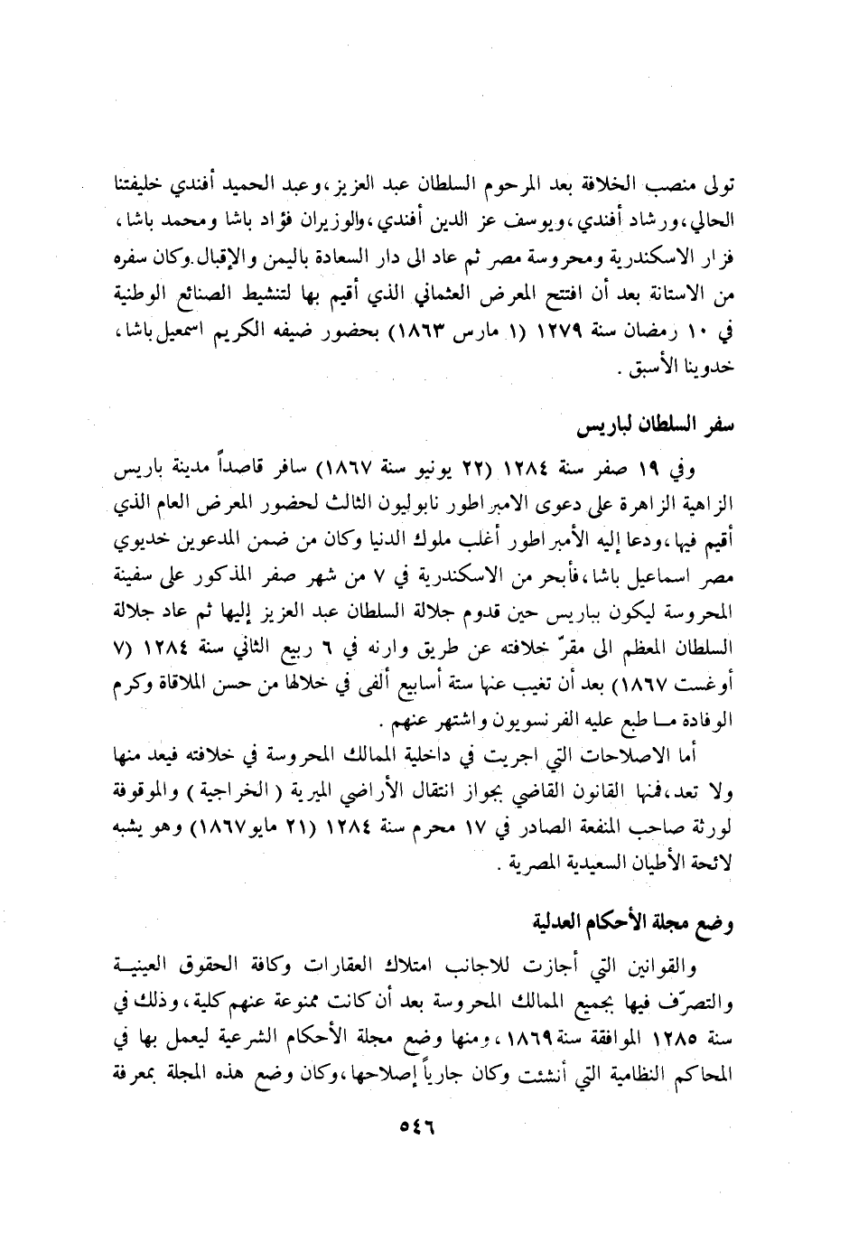 والقوانين الَّتِي اجازت للاجانب امتلاك العقارات وكافة الْحُقُوق العينية وَالتَّصَرُّف فِيهَا بِجَمِيعِ الممالك المحروسة بعد ان كَانَت مَمْنُوعَة عَنْهُم كُلية وَذَلِكَ فِي سنة 1285 الْمُوَافقَة سنة 1869 وَمِنْهَا وضع مجلة الاحكام الشَّرْعِيَّة ليعْمَل بهَا فِي المحاكم النظامية الَّتِي انشئت وَكَانَ جَارِيا اصلاحها وَكَانَ وضع هَذِه الْمجلة بِمَعْرِِفَة