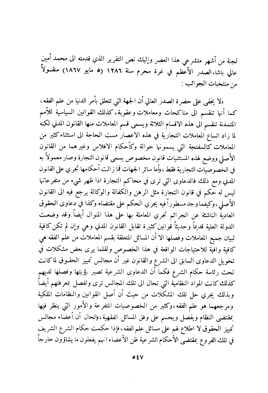 لجنة من اشهر متشرعي هَذَا الْعَصْر واليك نَص التَّقْرِير الَّذِي قَدمته إِلَى مُحَمَّد امين عالي باشا الصَّدْر الاعظم فِي غرَّة محرم سنة 1286 5 مايو 1867 مَنْقُولًا من منتخبات الجوائب