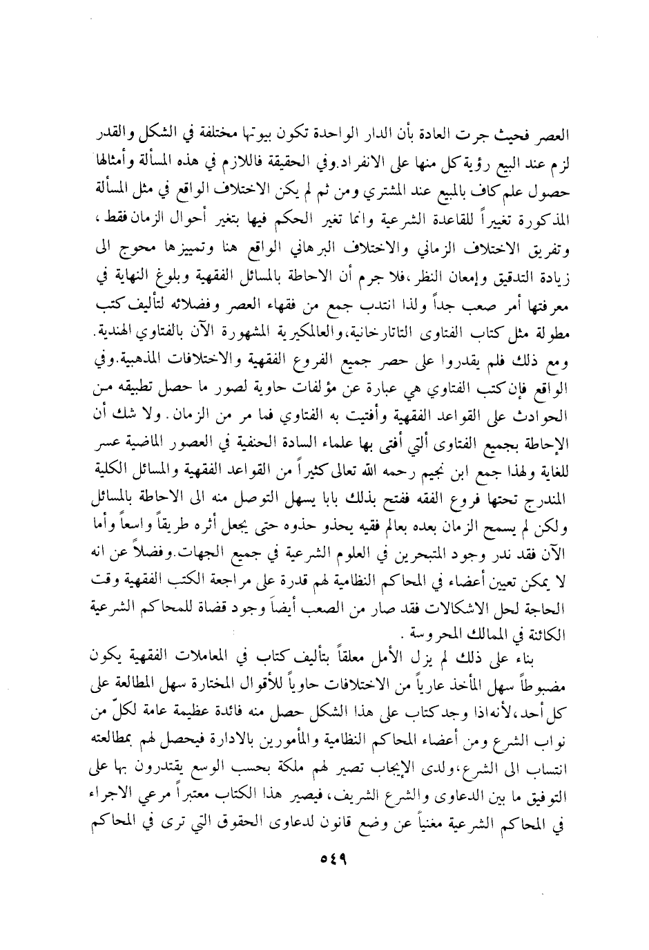 الْعَصْر فَحَيْثُ جرت الْعَادة بَان الدَّار الْوَاحِدَة تكون بيوتها مُخْتَلفَة فِي الشكل وَالْقدر لزم عِنْد البيع رُؤْيَة كل مِنْهَا على الِانْفِرَاد وَفِي الْحَقِيقَة فاللازم فِي هَذِه الْمَسْأَلَة وامثالها حُصُول علم كَاف بِالْمَبِيعِ عِنْد المُشْتَرِي وَمن ثمَّ لم يكن الِاخْتِلَاف الْوَاقِع فِي مثل الْمَسْأَلَة الْمَذْكُورَة تغييرا للقاعدة الشَّرْعِيَّة وانما تغير الحكم فِيهَا بِتَغَيُّر احوال الزَّمَان فَقَط وتفريق الِاخْتِلَاف الزماني وَالِاخْتِلَاف البرهاني الْوَاقِع هُنَا وتمييزها محوج إِلَى زِيَادَة التدقيق وامعان النّظر فَلَا جرم ان الاحاطة بالمسائل الْفِقْهِيَّة وبلوغ النِّهَايَة فِي مَعْرفَتهَا امْر صَعب جدا وَلذَا انتدب جمع من فُقَهَاء الْعَصْر وفضلائه لتأليف كتب مُطَوَّلَة مثل كتاب الْفَتَاوَى التاتارخانية خَانِية والعالمكيرية الْمَشْهُورَة الان بالفتاوي الْهِنْدِيَّة وَمَعَ ذَلِك فَلم يقدروا على حصر جَمِيع الْفُرُوع الْفِقْهِيَّة والاختلافات المذهبية وَفِي الْوَاقِع فان كتب الفتاوي هِيَ عبارَة عَن مؤلفات حاوية لصور مَا حصل تطبيقه من الْحَوَادِث على الْقَوَاعِد الْفِقْهِيَّة وافتيت بِهِ الفتاوي فَمَا مر من الزَّمَان وَلَا شكّ ان الاحاطة بِجَمِيعِ الْفَتَاوَى الَّتِي افتى بهَا عُلَمَاء السَّادة الْحَنَفِيَّة فِي العصور الْمَاضِيَة عسر للغاية وَلِهَذَا جمع ابْن نجيم رَحمَه الله تَعَالَى كثيرا من الْقَوَاعِد الْفِقْهِيَّة والمسائل الْكُلية المندرج تحتهَا فروع الْفِقْه فَفتح بذلك بَابا يسهل التَّوَصُّل مِنْهُ إِلَى الاحاطة بالمسائل وَلَكِن لم يسمح الزَّمَان بعده بعالم فَقِيه يحذو حذوه حَتَّى يَجْعَل اثره طَرِيقا وَاسِعًا واما الان فقد ندر وجود المتبحرين فِي الْعُلُوم الشَّرْعِيَّة فِي جَمِيع الْجِهَات وفضلا عَن انه لَا يُمكن تعْيين اعضاء فِي المحاكم النظامية لَهُم قدرَة على مُرَاجعَة الْكتب الْفِقْهِيَّة وَقت الْحَاجة لحل الاشكالات فقد صَار من الصعب ايضا وجود قُضَاة للمحاكم الشَّرْعِيَّة الكائنة فِي الممالك المحروسة