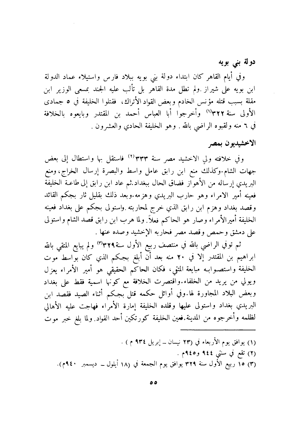 وَفِي ايام القاهر كَانَ ابْتِدَاء دولة بني بويه بِبِلَاد فَارس واستيلاء عماد الدولة ابْن بويه على شيراز وَلم تطل مُدَّة القاهر بل تَأَلُّبُ عَلَيْهِ الْجند بمسعى الْوَزير ابْن مقلة بِسَبَب قَتله مؤنس الْخَادِم وَبَعض القواد الاتراك فَقتلُوا الْخَلِيفَة فِي 5 جُمَادَى سنة 322 وأخرجوا أَبَا الْعَبَّاس أَحْمد بن المقتدر وَبَايَعُوهُ بالخلافة فِي 6 مِنْهُ ولقبوه الراضي بِاللَّه وَهُوَ الْخَلِيفَة الْحَادِي وَالْعشْرُونَ