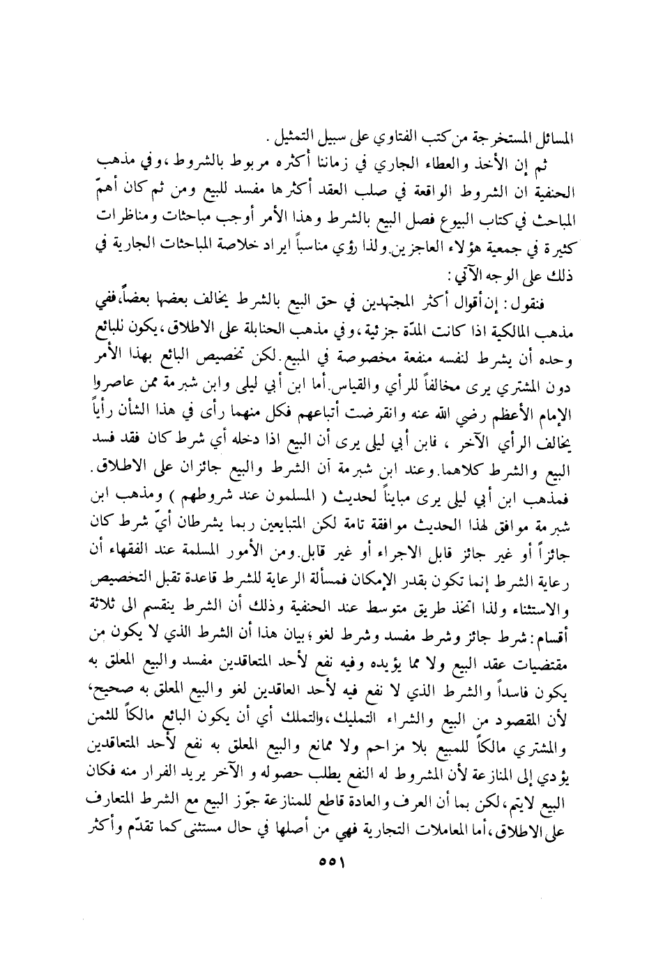 ثمَّ ان الاخذ وَالعطَاء الْجَارِي فِي زَمَاننَا اكثره مربوط بِالشُّرُوطِ وَفِي مَذْهَب الْحَنَفِيَّة ان الشُّرُوط الْوَاقِعَة فِي صلب العقد اكثرها مُفسد للْبيع وَمن ثمَّ كَانَ اهم المباحث فِي كتاب الْبيُوع فصل البيع بِالشّرطِ وَهَذَا الامر اوجب مباحثات ومناظرات كَثِيرَة فِي جمعية هَؤُلَاءِ العاجزين وَلذَا رُؤِيَ مناسبا ايراد خُلَاصَة المباحثات الْجَارِيَة فِي ذَلِك على الْوَجْه الْآتِي