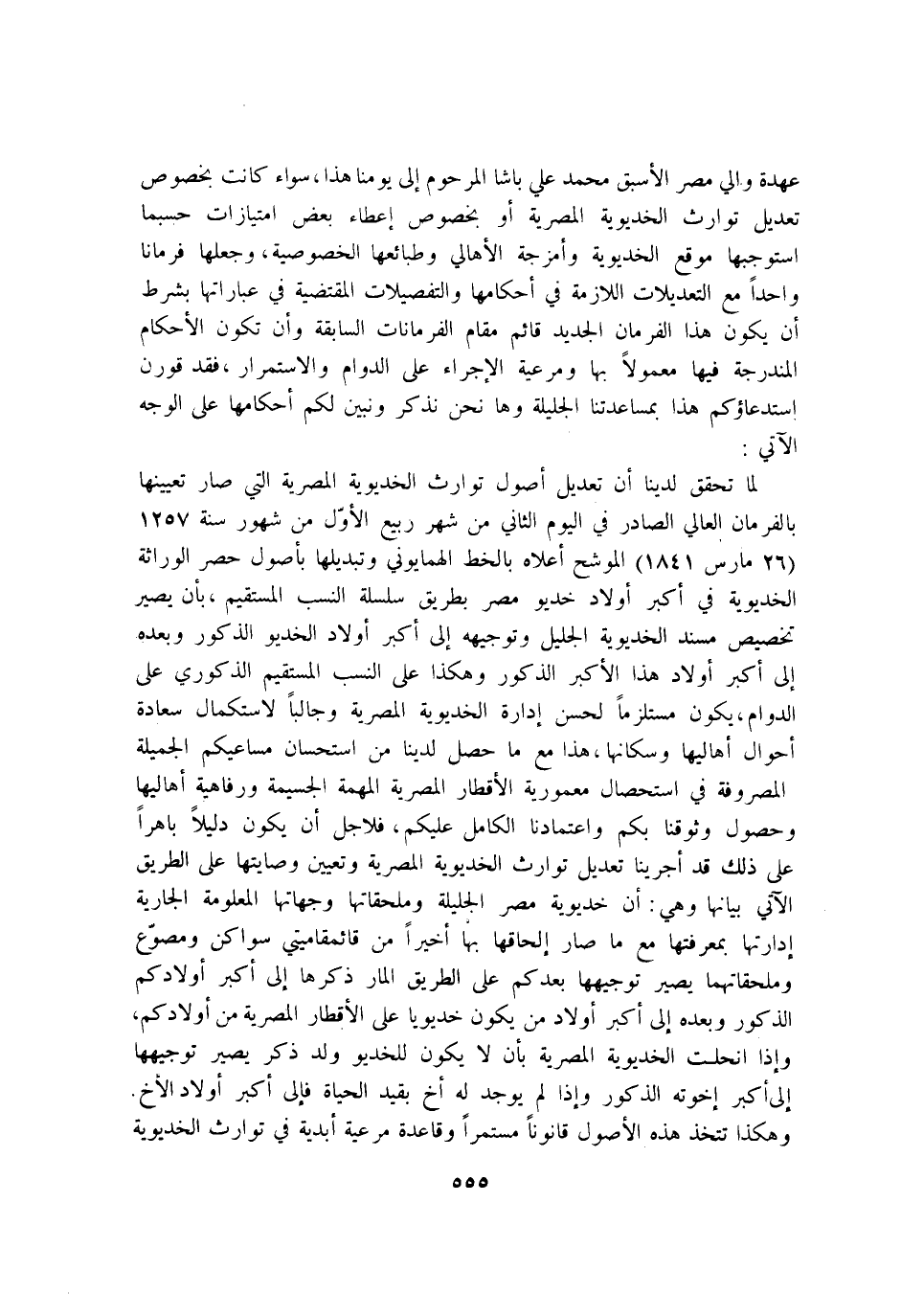 عُهْدَة وَالِي مصر الاسبق مُحَمَّد عَليّ باشا المرحوم إِلَى يَوْمنَا هَذَا سَوَاء كَانَت بِخُصُوص تَعْدِيل توارث الخديوية المصرية اَوْ بِخُصُوص اعطاء بعض امتيازات حَسْبَمَا استوجبها موقع الخديوية وامزجة الاهالي وطبائعها الخصوصية وَجعلهَا فرمانا وَاحِدًا مَعَ التعديلات اللَّازِمَة فِي احكامها والتفصيلات الْمُقْتَضِيَة فِي عباراتها بِشَرْط ان يكون هَذَا الفرمان الْجَدِيد قَائِم مقَام الفرمانات السَّابِقَة وان تكون الاحكام المندرجة فِيهَا مَعْمُولا بهَا ومرعية الاجراء على الدَّوَام والاستمرار فقد قورن استدعاؤكم هَذَا بمساعدتنا الجليلة وَهَا نَحن نذْكر ونبين لكم احكامها على الْوَجْه الْآتِي