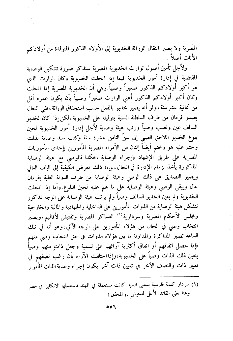 ولاجل تامين اصول توارث الخديوية المصرية سنذكر صُورَة تشكيل الْوِصَايَة الْمُقْتَضِيَة فِي ادارة امور الخديوية فِيمَا إِذا انْحَلَّت الخديوية وَكَانَ الْوَارِث الَّذِي هُوَ اكبر اولادكم الذُّكُور صَغِيرا وصبيا وَهِي ان الخديوية المصرية إِذا انْحَلَّت وَكَانَ اكبر اولادكم الذُّكُور اعني الْوَارِث صَغِيرا وصبيا بَان يكون عمره اقل من ثَمَانِيَة عشر سنة وَلَو انه يصير خديو بِالْفِعْلِ حسب اسْتِحْقَاق الوراثة فَفِي الْحَال يصدر فرمان من طرف السلطنة السّنيَّة بتوليته على الخديوية لَكِن إِذا كَانَ الخديو السالف عين وَنصب وَصِيّا ورتب هَيْئَة وصاية لاجل ادارة امور الخديوية لحين بُلُوغ الخديو اللَّاحِق الصَّبِي إِلَى سنّ الثَّامِن عشرَة سنة وَكتب سَنَد وصاية بذلك وَختم عَلَيْهِ هُوَ وَختم ايضا اثْنَان من الامراء المصرية المأمورين باحدى المأموريات المصرية على طَرِيق الاشهاد واجراء الْوِصَايَة هَكَذَا فالوصي مَعَ هَيْئَة الْوِصَايَة الْمَذْكُورَة ياخذ بزمام الادارة فِي الْحَال وَبعد ذَلِك تعرض الْكَيْفِيَّة إِلَى الْبَاب العالي وَيصير التَّصْدِيق على ذَلِك الْوَصِيّ وهيئة الْوِصَايَة من طرف الدولة الْعلية بفرمان عَال وَيبقى الْوَصِيّ وهيئة الْوِصَايَة على مَا هم عَلَيْهِ لحين الْبلُوغ واما إِذا انْحَلَّت الخديوية وَلم يعين الخديو السالف وَصِيّا وَلم يرتب هَيْئَة الْوِصَايَة على الْوَجْه الْمَذْكُور تتشكل هَيْئَة الْوِصَايَة من الذوات المأمورين على الداخلية والجهادية والمالية والخارجية ومجلس الاحكام المصرية وسردارية العساكر المصرية وتفتيش الاقاليم وَيصير انتخاب وَصِيّ فِي الْحَال من هَؤُلَاءِ المأمورين على الْوَجْه الْآتِي وَهُوَ أَنه فِي تِلْكَ السَّاعَة تصير المذاكرة والمداولة مَا بَين هَؤُلَاءِ الذوات فِي حق انتخاب وَصِيّ مِنْهُم فغذا حصل اتِّفَاقهم اَوْ اتِّفَاق اكثرية آرائهم على تَسْمِيَة وَجعل ذَات مِنْهُم وَصِيّا يتَعَيَّن ذَلِك الذَّات وَصِيّا على الخديوية وَإِذا اخْتلفت الآراء بَان رغب نصفهم فِي تعْيين ذَات وَالنّصف الآخر فِي تعْيين ذَات آخر يكون اجراء وصاية الذَّات الْمَأْمُور