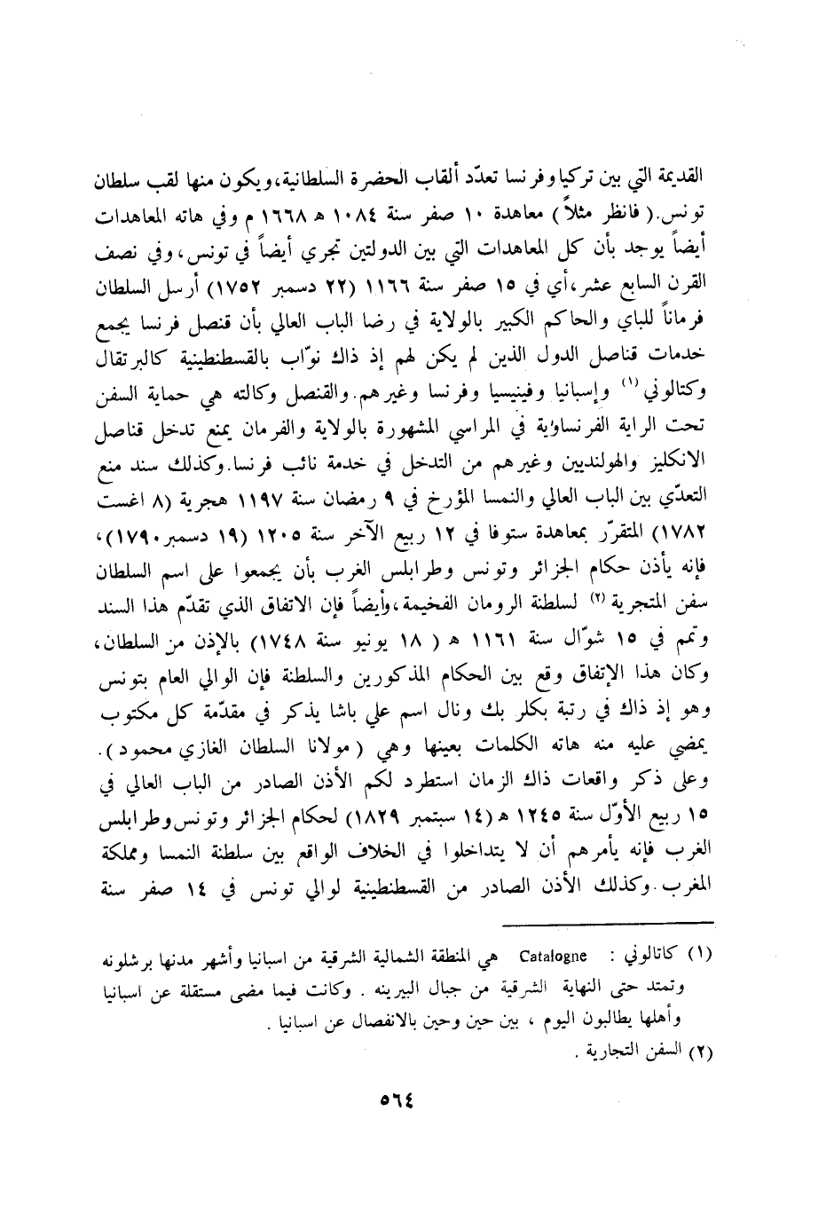 الْقَدِيمَة الَّتِي بَين تركيا وفرنسا تعدد القاب الحضرة السُّلْطَانِيَّة وَيكون مِنْهَا لقب سُلْطَان تونس فَانْظُر مثلا معاهدة 10 صفر سنة 1084 هـ 1668 م وَفِي هاته المعاهدات ايضا يُوجد بَان كل المعاهدات الَّتِي بَين الدولتين تجْرِي ايضا فِي تونس وَفِي نصف الْقرن السَّابِع عشر أَي فِي 15 صفر سنة 1166 22 دسمبر 1752 ارسل السُّلْطَان فرمانا للباي وَالْحَاكِم الْكَبِير بِالْولَايَةِ فِي رضَا الْبَاب العالي بَان قنصل فرنسا يجمع خدمات قناصل الدولة الَّذين لم يكن لَهُم اذ ذَاك نواب بِالْقُسْطَنْطِينِيَّةِ كالبرتقال وكتالوني واسبانيا وفينيسيا وفرنسا وَغَيرهم والقنصل وكَالَته هِيَ حماية السفن تَحت الرَّايَة الفرنساوية فِي المراسي الْمَشْهُورَة بِالْولَايَةِ والفرمان يمْنَع تدخل قناصل الانكليز والهولنديين وَغَيرهم من التدخل فِي خدمَة نَائِب فرنسا وَكَذَلِكَ سَنَد منع التَّعَدِّي بَين الْبَاب العالي والنمسا المؤرخ فِي 9 رَمَضَان سنة 1197 هجرية 8 اغست 1782 المتقرر بمعاهدة ستوفا فِي 12 ربيع الآخر سنة 1205 19 دسمبر 1790 فانه ياذن حكام الجزائر وتونس وطرابلس الغرب بَان يجمعوا على اسْم السُّلْطَان سفن المتجرية لسلطنة الرومان الفخيمة وايضا فان الِاتِّفَاق الَّذِي تقدم هَذَا السَّنَد وتمم فِي 15 شَوَّال سنة 1161 هـ 18 يونيو سنة 1748 بالاذن من السُّلْطَان وَكَانَ هَذَا الِاتِّفَاق وَقع بَين الْحُكَّام الْمَذْكُورين والسلطنة فان الْوَالِي الْعَام بتونس وَهُوَ اذ ذَاك فِي رُتْبَة بكلر بك ونال اسْم عَليّ باشا يذكر فِي مُقَدّمَة كل مَكْتُوب يمْضِي عَلَيْهِ مِنْهُ هاته الْكَلِمَات بِعَينهَا وَهِي مَوْلَانَا السُّلْطَان الْغَازِي مَحْمُود وعَلى ذكر واقعات ذَاك الزَّمَان استطرد لكم الاذن الصَّادِر من الْبَاب العالي فِي 15 ربيع الاول سنة 1245 هـ 14 سبتمبر 1829 لحكام الجزائر وتونس وطرابلس الغرب فانه يامرهم ان لَا يتداخلوا فِي الْخلاف الْوَاقِع بَين سلطنة النمسا ومملكة الْمغرب وَكَذَلِكَ الاذن الصَّادِر من الْقُسْطَنْطِينِيَّة لوالي تونس فِي