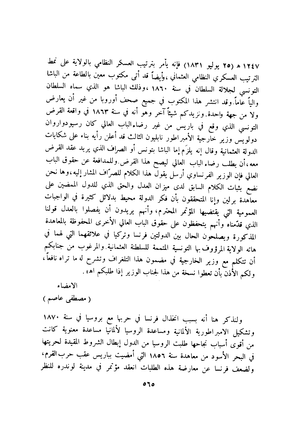 14 - صفر سنة 1247 هـ 25 يوليو 1831 فانه يامر بترتيب الْعَسْكَر النظامي بِالْولَايَةِ على نمط التَّرْتِيب العسكري النظامي العثماني وايضا قد اتى مَكْتُوب معِين بِالطَّاعَةِ من الباشا التّونسِيّ لجلالة السُّلْطَان فِي سنة 1860 وَذَلِكَ الباشا هُوَ الَّذِي سَمَّاهُ السُّلْطَان واليا عَاما وَقد انْتَشَر هَذَا الْمَكْتُوب فِي جَمِيع صحف اوروبا من غير ان يُعَارض وَلَا من جِهَة وَاحِدَة ونزيدكم شَيْئا آخر وَهُوَ انه فِي سنة 1863 فِي وَاقعَة الْقَرْض التّونسِيّ الَّذِي وَقع فِي باريس من غير رِضَاء الْبَاب العالي كَانَ رسيودواروان دولويس وَزِير خارجية الامبراطور نابليون الثَّالِث قد اعلن رايه بِنَاء على شكايات الدولة العثمانية وَقَالَ انه يلْزم اما الباشا بتونس اَوْ الصراف الَّذِي يُرِيد عقد الْقَرْض مَعَه ان يطْلب رِضَاء الْبَاب العالي ليَصِح هَذَا الْقَرْض وللمدافعة عَن حُقُوق الْبَاب العالي فان الْوَزير الفرنساوي ارسل يَقُول هَذَا الْكَلَام للصراف الْمشَار اليه وهانحن نضع بثبات الْكَلَام السَّابِق لَدَى ميزَان الْعدْل وَالْحق الَّذِي للدول الممضين على معاهدة برلين وانا المتحققون بَان فكر الدولة مُحِيط بدلائل كَثِيرَة فِي الْوَاجِبَات العمومية الَّتِي يقتضيها المؤتمر الْمُحْتَرَم وانهم يُرِيدُونَ ان يفصلوا بِالْعَدْلِ قَوْلنَا الَّذِي قدمْنَاهُ وانهم يتحفظون على حُقُوق الْبَاب العالي الاخرى المحفوظة بالمعاهدة الْمَذْكُورَة ويصلحون الْحَال بَين الدولتين فرنسا وتركيا فِي علائقهما الَّتِي لَهما فِي هاته الْولَايَة المرؤوف بهَا التونسية المتممة للسلطنة العثمانية والمرغوب من جنابكم ان تَتَكَلَّم مَعَ وَزِير الخارجية فِي مَضْمُون هَذَا التلغراف وتشرح لَهُ مَا ترَاهُ نَافِعًا وَلكم الاذن بَان تعطوا نُسْخَة من هَذَا لجناب الْوَزير إِذا طَلَبكُمْ اه