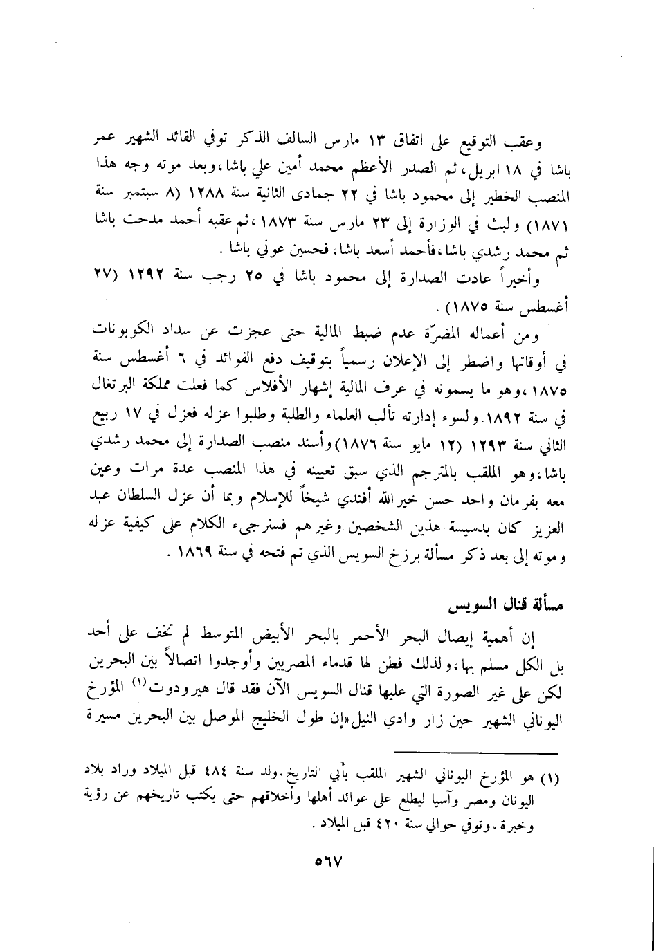 وَمن اعماله الْمضرَّة عدم ضبط الْمَالِيَّة حَتَّى عجزت عَن سداد الكوبونات فِي اوقاتها واضطر إِلَى الاعلان رسميا بتوقيف دفع الْفَوَائِد فِي 6 اغسطس سنة 1875 وَهُوَ مَا سيمونه فِي عرف الْمَالِيَّة اشهار الافلاس كَمَا فعلت مملكة البرتغال فِي سنة 1892 ولسوء ادارته تَأَلُّبُ الْعلمَاء والطلبة وطلبوا عَزله فعزل فِي 17 ربيع الثَّانِي سنة 1293 12 مايو سنة 1876 وَاسْنِدِ منصب الصدارة إِلَى مُحَمَّد رشدي باشا وَهُوَ الملقب بالمترجم الَّذِي سبق تَعْيِينه فِي هَذَا المنصب عدَّة مَرَّات وَعين مَعَه بفرمان وَاحِد حسن خير الله افندي شَيخا للاسلام وَبِمَا ان عزل السُّلْطَان عبد الْعَزِيز كَانَ بدسيسة هذَيْن الشخصين وَغَيرهم فسنرجئ الْكَلَام على كَيْفيَّة عَزله وَمَوته إِلَى بعد ذكر مَسْأَلَة برزخ السويس الَّذِي تمّ فَتحه فِي سنة 1869