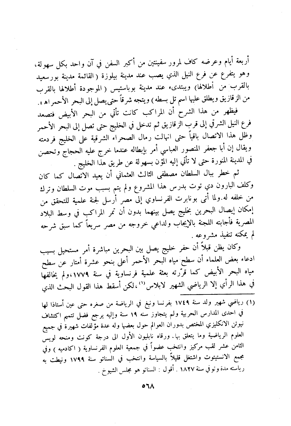 ثمَّ خطر ببال السُّلْطَان مصطفى الثَّالِث العثماني ان يُعِيد الِاتِّصَال كَمَا كَانَ وكلف البارون دي توت بدرس هَذَا الْمَشْرُوع وَلم يتم بِسَبَب موت السُّلْطَان وَترك من خَلفه لَهُ وَلما اتى بونابرت الفرنساوي إِلَى مصر ارسل لجنة علمية للتحقق من امكان ايصال الْبَحْرين بخليج يصل بَينهمَا بِدُونِ ان تمر المراكب فِي وسط الْبِلَاد المصرية فاجابته اللجنة بالايجاب ولداعي خُرُوجه من مصر سَرِيعا كَمَا سبق شَرحه لم يُمكنهُ تَنْفِيذ مشروعه