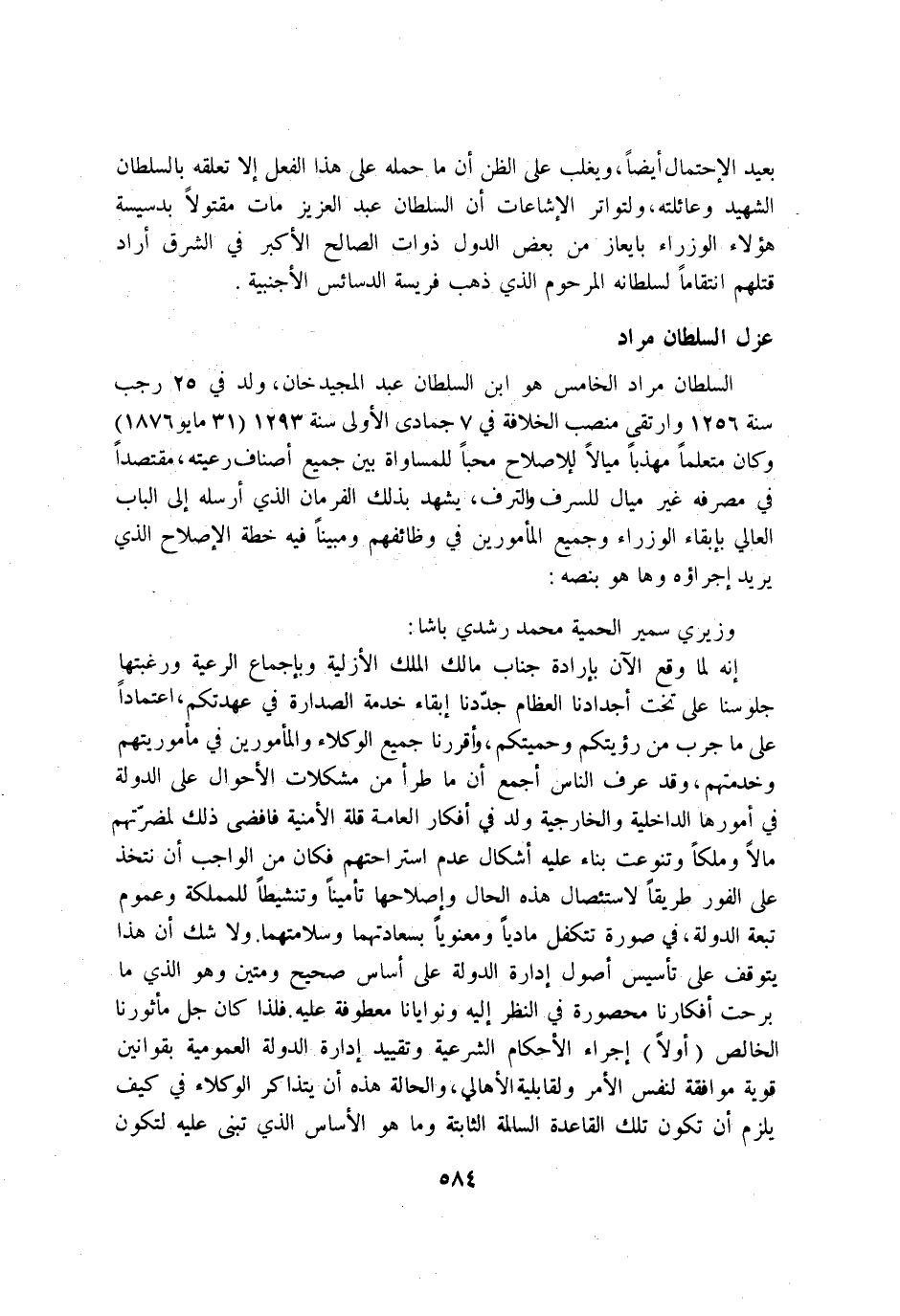السُّلْطَان مُرَاد الْخَامِس هُوَ ابْن السُّلْطَان عبد الْمجِيد خَان ولد فِي 25 رَجَب سنة 1256 وارتقى منصب الْخلَافَة فِي 7 جُمَادَى الاولى سنة 1293 31 مايو 1876 وَكَانَ متعلما مهذبا ميالا للاصلاح محبا للمساواة بَين جَمِيع اصناف رَعيته مقتصدا فِي مصرفه غير ميال للسرف والترف يشْهد بذلك الفرمان الَّذِي ارسله إِلَى الْبَاب العالي بابقاء الوزراء وَجَمِيع المأمورين فِي وظائفهم ومبينا فِيهِ خطة الاصلاح الَّذِي يُرِيد اجراؤه وَهَا هُوَ بنصه