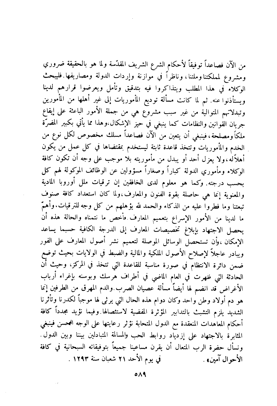 من الْآن فَصَاعِدا تَوْفِيقًا لاحكام الشَّرْع الشريف المقدسة وَلما هُوَ بِالْحَقِيقَةِ ضَرُورِيّ ومشروع لمملكتنا وملتنا وناظرا فِي موازنة واردات الدولة ومصاريفها فليبحث الوكلاء فِي هَذَا الْمطلب ويتذاكروا فِيهِ بتدقيق وَتَأمل ويعرضوا قرارهم لدينا ويستأذنوا عَنهُ ثمَّ لما كَانَت مَسْأَلَة توديع المأموريات إِلَى غير اهلها من المأمورين وتبدلاتهم المتوالية من غير سَبَب مَشْرُوع هِيَ من جملَة الامور الباعثة على ايقاع جَرَيَان القوانين والنظامات كَمَا يَنْبَغِي فِي حيّز الاشكال وَهَذَا مِمَّا يَأْتِي بكبير الْمضرَّة ملكا ومصلحة فَيَنْبَغِي ان يتَعَيَّن من الْآن فَصَاعِدا مَسْلَك مَخْصُوص لكل نوع من الخدم والمأموريات وتتخذ قَاعِدَة ثَابِتَة ليستخدم بمقتضاها فِي كل عمل من يكون اهلا لَهُ وَلَا يعْزل اُحْدُ اَوْ يُبدل من ماموريته بِلَا مُوجب على وَجه ان تكون كَافَّة الوكلاء وماموري الدولة كبارًا وصغارا مسؤولين عَن الْوَظَائِف الموكولة لَهُم كل بِحَسب دَرَجَته وكما هُوَ مَعْلُوم لَدَى الْخَافِقين ان ترقيات ملل اوروبا المادية والمعنوية انما هِيَ حَاصِلَة بِقُوَّة الْفُنُون والمعارف وَلما كَانَ استعداد كَافَّة صنوف تبعتنا وَمَا فطروا عَلَيْهِ من الذكاء وَالْحَمْد لله يؤهلهم من كل وَجه للترقيات واهم مَا لدينا من الامور الاسراع بتعميم المعارف فاخص مَا نتمناه وَالْحَالة هَذِه ان يحصل الِاجْتِهَاد بابلاغ تخصيصات المعارف إِلَى الدرجَة الكافية حَسْبَمَا يساعد الامكان وان تستحصل الْوَسَائِل الموصلة لتعميم نشر اصول المعارف على الْفَوْر ويبادر عَاجلا لاصلاح الاصول الملكية والمالية والضبط فِي الولايات بِحَيْثُ تُوضَع ضمن دَائِرَة الانتظام فِي صُورَة مُنَاسبَة للقاعدة الَّتِي تتَّخذ فِي المركز وَحَيْثُ ان الْحَادِثَة الَّتِي ظَهرت فِي الْعَام الْمَاضِي فِي اطراف هرسك وبوسنه باغراء ارباب الاغراض قد انْضَمَّ لَهَا ايضا مَسْأَلَة عصيان الصرب وَالدَّم المهرق من الطَّرفَيْنِ انما هُوَ دم اولاد وَطن وَاحِد وَكَانَ دوَام هَذِه الْحَال الَّتِي يرثى لَهَا مُوجبا لكدرنا وتأثرنا الشَّديد يلْزم التشبث بالتدابير المؤثرة المفضية لاستئصالها وَفِيمَا نؤيد مجددا كَافَّة احكام المعاهدات المنعقدة مَعَ الدول المتحابة نؤثر رعايتها على الْوَجْه الْحسن فَيَنْبَغِي المثابرة بِالِاجْتِهَادِ على ازدياد روابط الْحبّ والمسالمة المتبادلين بَيْننَا وَبَين الدول ونسأل حَضْرَة الرب المتعال ان يقرن مساعينا جَمِيعًا بتوفيقاته السبحانية فِي كَافَّة الاحوال امين فِي يَوْم الاحد 21 شعْبَان سنة 1293