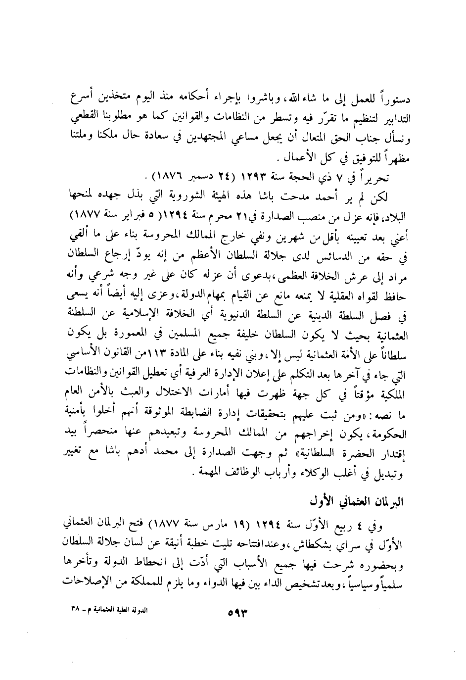 وَفِي 4 ربيع الاول سنة 1294 19 مارس سنة 1877 فتح البرلمان العثماني الاول فِي سراي بشكطاش وَعند افتتاحه تليت خطْبَة انيقة عَن لِسَان جلالة السُّلْطَان وبحضوره شرحت فِيهَا جَمِيع الاسباب الَّتِي ادت إِلَى انحطاط الدولة وتأخرها سلميا وسياسيا وَبعد تشخيص الدَّاء بَين فِيهَا الدَّوَاء وَمَا يلْزم للملكة من الاصلاحات