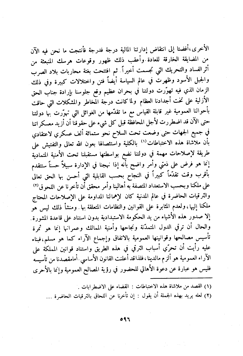 الاخرى افضتا إِلَى انْتِقَاض ادارتنا الْمَالِيَّة دَرَجَة فدرجة فانتجت مَا نَحن فِيهِ الْآن من المضايقة الخارقة للْعَادَة واعقب ذَلِك ظُهُور وقوعات هرسك المنبعثة من اثر الْفساد والتحريك الَّتِي تجسمت اخيرا ثمَّ افتتحت بَغْتَة محاربات بِلَاد الصرب والجبل الاسود وَظَهَرت فِي عَالم السياسة ايضا فتن واختلالات كَبِيرَة وَفِي ذَلِك الزَّمَان الَّذِي فِيهِ تهورت دولتنا فِي بحران عَظِيم وَقع جلوسنا بارادة جناب الْحق الازلية على تخت اجدادنا الْعِظَام وَلما كَانَت دَرَجَة المخاطر والمشكلات الَّتِي حاقت باحوالنا العمومية غير قَابِلَة الْقيَاس مَعَ مَا تقدمها من الغوائل الَّتِي تهورت بهَا دولتنا حَتَّى الْآن قد اضطررت لاجل الْمُحَافظَة قبل كل شَيْء على حقوقنا ان ازيد معسكراتنا فِي جَمِيع الْجِهَات حَتَّى وضعت تَحت السِّلَاح نَحْو سِتّمائَة الف عسكري لاعتقادي بِأَن ملاشاة هَذِه الاختباطات بِالْكُلِّيَّةِ واستئصالها بعون الله تَعَالَى والتفتيش على طَريقَة لاصلاحات مهمة فِي دولتنا نضع بواسطتها مستقبلنا تَحت الامنية المتمادية انما هُوَ فرض على ذِمَّتِي وامر وَاضح بانه إِذا نهجنا فِي الادارة سَبِيلا حسنا ستتقدم باقرب وَقت تقدما كَبِيرا فِي النجاح بِحَسب القابلية الَّتِي احسن بهَا الْحق تَعَالَى على ملكنا وبحسب الاستعداد المتصفة بِهِ اهالينا وامر مُحَقّق ان تأخرنا عَن اللحوق والترقيات الْحَاضِرَة فِي عَالم المدنية كَانَ لاهمالنا المداومة على الاصلاحات الْمُحْتَاج ملكنا اليها وَلعدم المثابرة على القوانين والنظامات الْمُتَعَلّقَة بهَا ومنشأ ذَلِك لَيْسَ هُوَ الا صُدُور هَذِه الاشياء من يَد الْحُكُومَة الاستبدادية بِدُونِ استناد على قَاعِدَة المشورة وَالْحَال ان ترقي الدول المتمدنة ونجاحها وامنية الممالك وعمرانها انما هُوَ ثَمَرَة تأسيس مصالحها وقوانينها العمومية بالِاتِّفَاقِ واجماع الآراء كَمَا هُوَ مُسلم فبناء عَلَيْهِ رَأَيْت ان تحري اسباب الترقي فِي هَذِه الطَّرِيق واستناد قوانين المملكة على الآراء العمومية هُوَ الزم مَا لدينا فَلِذَا قد اعلنت القانون الاساسي اما مقصدنا من تأسيسه فَلَيْسَ هُوَ عبارَة عَن دَعْوَة الاهالي للحضور فِي رُؤْيَة الْمصَالح العمومية وانما بالاحرى