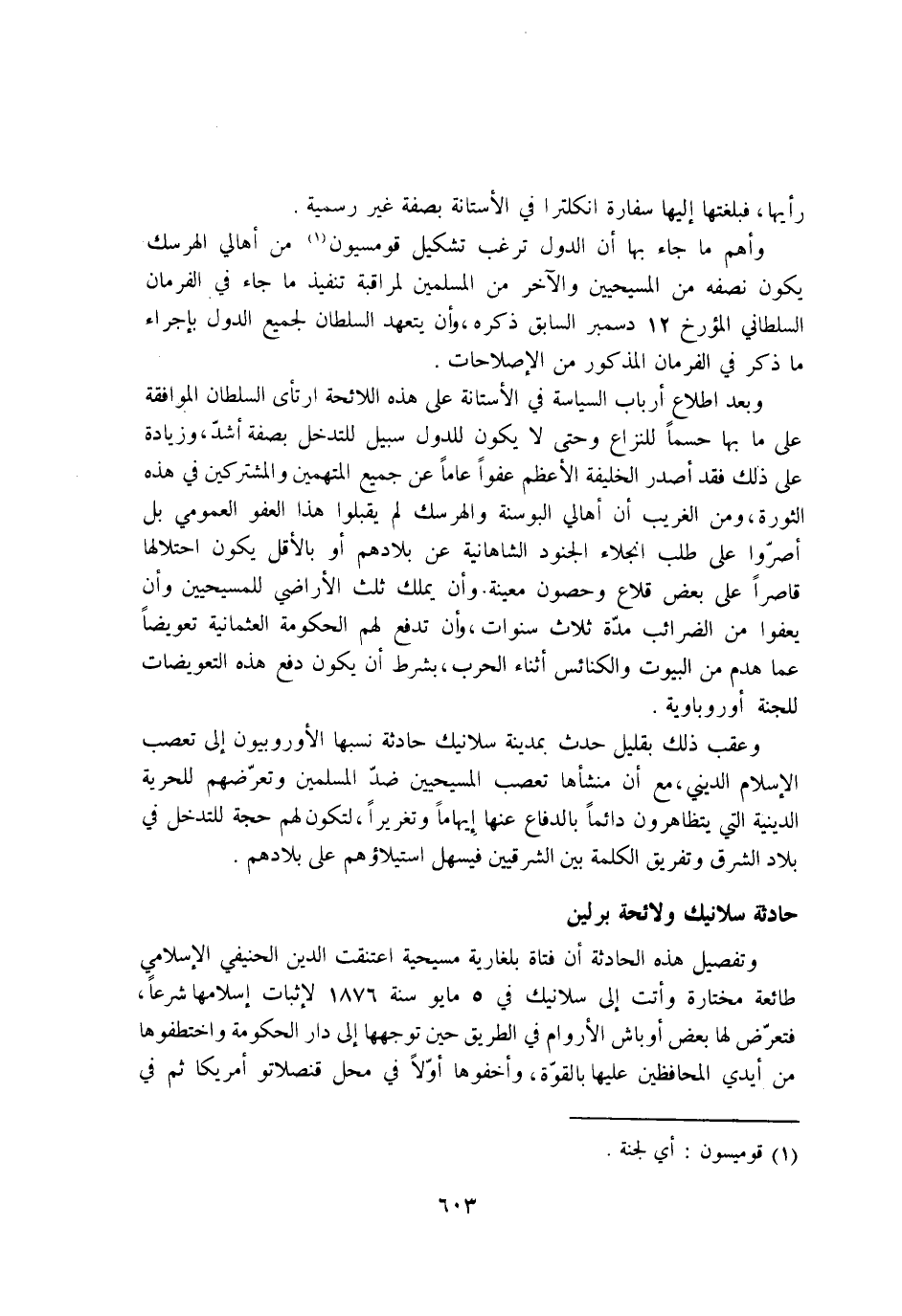 وعقب ذَلِك بِقَلِيل حدث بِمَدِينَة سلانيك حَادِثَة نَسَبهَا الاوروبيون إِلَى تعصب الاسلام الديني مَعَ ان منشأها تعصب المسيحيين ضد الْمُسلمين وتعرضهم للحرية الدِّينِيَّة الَّتِي يتظاهرون دَائِما بالدفاع عَنْهَا ايهاما وتغريرا لتَكون لَهُم حجَّة للتدخل فِي بِلَاد الشرق وتفريق الْكَلِمَة بَين الشرقيين فيسهل استيلاؤهم على بِلَادهمْ