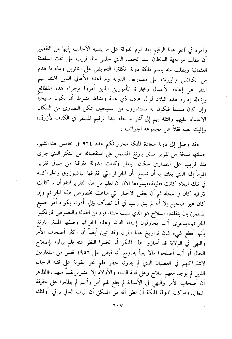 وامره فِي آخر هَذَا الرقيم بعد لوم الدولة على مَا ينْسبهُ الاجانب اليها من التَّقْصِير ان يطْلب مُوَاجهَة السُّلْطَان عبد الحميد الَّذِي جلس مُنْذُ قريب على تخت السلطنة العثمانية وَيطْلب مِنْهُ باسم ملكة دولة انكلترا التعويض على الثائرين وَبِنَاء مَا هدم من الْكَنَائِس والبيوت على مصاريف الدولة ومساعدة الاهالي الَّذين اشْتَدَّ بهم الْفقر على اعادة الاعمال ومجازاة المامورين الَّذين امروا باجراء هَذِه الفظائع واناطة ادارة هَذِه الْبِلَاد لوال عَادل ذِي همة ونشاط بِشَرْط ان يكون مسيحيا وان كَانَ مُسلما فَيكون لَهُ مستاشرون من المسيحيين يُمكن النَّصَارَى من السكان الِاعْتِمَاد عَلَيْهِم والثقة بهم إِلَى آخر مَا جَاءَ بِهَذَا الرقيم المسطر فِي الْكتاب الازرق واليك نَصه نقلا عَن مَجْمُوعَة الجوائب