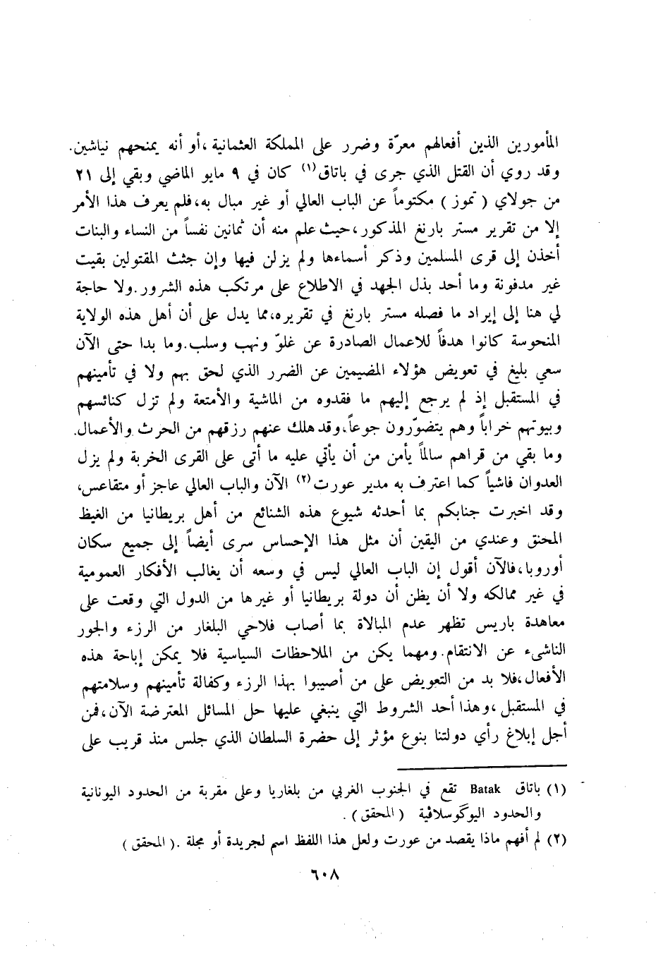 المامورين الَّذين افعالهم معرة وضرر على المملكة العثمانية اَوْ انه يمنحهم نياشين وَقد رُوِيَ ان الْقَتْل الَّذِي جرى فِي باتاق كَانَ فِي 9 مايو الْمَاضِي وَبَقِي إِلَى 21 من جولاي تموز مكتوما عَن الْبَاب العالي اَوْ غير مبال بِهِ فَلم يعرف هَذَا الامر الا من تَقْرِير مستر بارنغ الْمَذْكُور حَيْثُ علم مِنْهُ ان ثَمَانِينَ نفسا من النِّسَاء وَالْبَنَات اخذن إِلَى قرى الْمُسلمين وَذكر اسماءها وَلم يزلن فِيهَا وان جثث المقتولين بقيت غير مدفونة وَمَا اُحْدُ بذل الْجهد فِي الِاطِّلَاع على مرتكب هَذِه الشرور وَلَا حَاجَة لي هُنَا إِلَى ايراد مَا فَصله مستر بارنغ فِي تَقْرِيره مِمَّا يدل على ان اهل هَذِه الْولَايَة المنحوسة كَانُوا هدفا للاعمال الصادرة عَن غلو وَنهب وسلب وَمَا بدا حَتَّى الْآن سعي بليغ فِي تعويض هَؤُلَاءِ المضيمين عَن الضَّرَر الَّذِي لحق بهم وَلَا فِي تامينهم فِي الْمُسْتَقْبل اذ لم يرجع اليهم مَا فقدوه من الْمَاشِيَة والامتعة وَلم تزل كنائسهم وَبُيُوتهمْ خرابا وهم يتضورون جوعا وَقد هلك عَنْهُم رزقهم من الْحَرْث والاعمال وَمَا بَقِي من قراهم سالما يامن من ان يَأْتِي عَلَيْهِ مَا اتى على الْقرى الخربة وَلم يزل الْعدوان فاشيا كَمَا اعْترف بِهِ مدير عورت الْآن وَالْبَاب العالي عَاجز اَوْ متقاعس وَقد اخبرت جنابكم بِمَا احدثه شيوع هَذِه الشنائع من اهل بريطانيا من الغيظ المحنق وَعِنْدِي من الْيَقِين ان مثل هَذَا الاحساس سرى ايضا إِلَى جَمِيع سكان اوروبا فَالْآن اقول ان الْبَاب العالي لَيْسَ فِي وَسعه ان يغالب الافكار العمومية فِي غير ممالكه وَلَا ان يظنّ ان دولة بريطانيا اَوْ غَيرهَا من الدول الَّتِي وَقعت على معاهدة باريس تظهر عدم المبالاة بِمَا اصاب فلاحي البلغار من الرزء والجور النَّاشِئ عَن الانتقام وَمهما يكن من الملاحظات السياسية فَلَا يُمكن اباحة هَذِه الافعال فَلَا بُد من التعويض على من اصيبوا بِهَذَا الرزء وكفالة تامينهم وسلامتهم فِي الْمُسْتَقْبل وَهَذَا اُحْدُ الشُّرُوط الَّتِي يَنْبَغِي عَلَيْهَا حل الْمسَائِل المعترضة الْآن فَمن اجل ابلاغ رَأْي دولتنا بِنَوْع مُؤثر إِلَى حَضْرَة السُّلْطَان الَّذِي جلس مُنْذُ قريب على