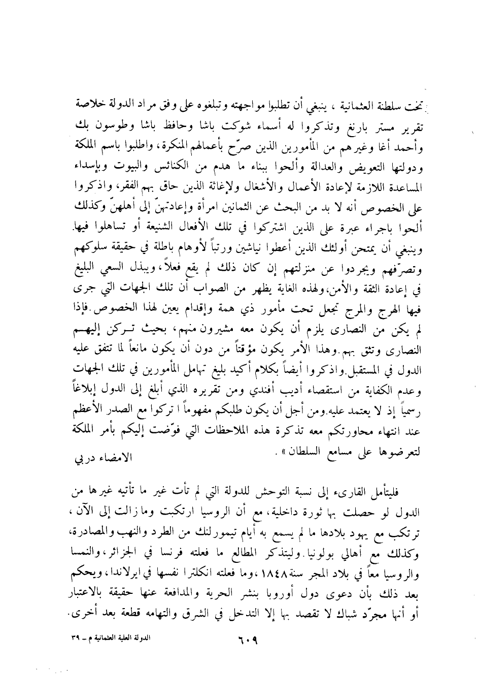 تخت سلطنة العثمانية يَنْبَغِي ان تَطْلُبُوا مواجهته وتبلغوه على وفْق مُرَاد الدولة خُلَاصَة تَقْرِير مستر بارنغ وتذكروا لَهُ اسماء شوكت باشا وحافظ باشا وطوسون بك وَاحْمَدْ اغا وَغَيرهم من المامورين الَّذين صرح باعمالهم الْمُنكرَة واطلبوا باسم الملكة ودولتها التعويض وَالْعَدَالَة والحوا ببناءما هدم من الْكَنَائِس والبيوت وباسداء المساعدة اللَّازِمَة لاعادة الاعمال والاشغال ولاغاثة الَّذين حاق بهم الْفقر واذْكُرُوا على الْخُصُوص انه لَا بُد من الْبَحْث عَن الثَّمَانِينَ امْرَأَة واعادتهن إِلَى اهلهن وَكَذَلِكَ الحوا باجراء عِبْرَة على الَّذين اشْتَركُوا فِي تِلْكَ الافعال الشنيعة اَوْ تساهلوا فِيهَا وَيَنْبَغِي ان يمْتَحن اولئك الَّذين اعطوا نياشين ورتبا لاوهام بَاطِلَة فِي حَقِيقَة سلوكهم وتصرفهم ويجردوا عَن مَنْزِلَتهمْ ان كَانَ ذَلِك لم يَقع فعلا ويبذل السَّعْي البليغ فِي اعادة الثِّقَة والامن ولهذه الْغَايَة يظْهر من الصَّوَاب ان تِلْكَ الْجِهَات الَّتِي جرى فِيهَا الْهَرج والمرج تجْعَل تَحت مامور ذِي همة واقدام يعين لهَذَا الْخُصُوص فاذا لم يكن من النَّصَارَى يلْزم ان يكون مَعَه مشيرون مِنْهُم بِحَيْثُ تركن اليهم النَّصَارَى وتثق بهم وَهَذَا الامر يكون مؤقتا من دون ان يكون مَانِعا لما تتفق عَلَيْهِ الدول فِي الْمُسْتَقْبل واذْكُرُوا ايضا بِكَلَام اكيد بليغ تهامل المامورين فِي تِلْكَ الْجِهَات وَعدم الْكِفَايَة من استقصاء اديب افندي وَمن تَقْرِيره الَّذِي ابلغ إِلَى الدول ابلاغا رسميا اذ لَا يعْتَمد عَلَيْهِ وَمن اجل ان يكون طَلَبكُمْ مفهوما اتْرُكُوا مَعَ الصَّدْر الاعظم عِنْد انْتِهَاء محاورتكم مَعَه تذكره هَذِه الملاحظات الَّتِي فوضت اليكم بامر الملكة لتعرضوها على مسامع السُّلْطَان الامضاء دربي