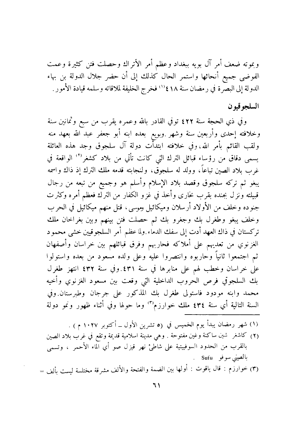 وَفِي ذِي الْحجَّة سنة 422 توفّي الْقَادِر بِاللَّه وعمره يقرب من سبع وَثَمَانِينَ سنة وخلافته احدى واربعين سنة وَشهر وبويع بعده ابْنه ابو جَعْفَر عبد الله بِعَهْد مِنْهُ ولقب الْقَائِم بامر الله وَفِي خِلَافَته ابتدأت دولة آل سلجوق وجد هَذِه العائلة يُسمى دقاق من رُؤَسَاء قبائل التّرْك الَّتِي كَانَت تَأتي من بِلَاد كشغر الْوَاقِعَة فِي غرب بِلَاد الصين تباعا وَولد لَهُ سلجوق ولنجابته قدمه ملك التّرْك اذ ذَاك واسْمه يبغو ثمَّ تَركه سلجوق وَقصد بِلَاد الاسلام واسلم هُوَ وَجَمِيع من تبعه من رجال قبيلته وَنزل بجنده بِقرب بُخَارى واخذ فِي غَزْو الْكفَّار من التّرْك فَعظم امْرَهْ وَكَثُرت جُنُوده وَخلف من الاولاد ارسلان وَمِيكَائِيل ومُوسَى قتل مِنْهُم مِيكَائِيل فِي الْحَرْب وَخلف يبغو وطغرل بك وجغرو بك ثمَّ حصلت فتن بَينهم وَبَين بغراخان ملك تركستان فِي ذَاك الْعَهْد ادت إِلَى سفك الدِّمَاء وَلما عظم امْر السلجوقيين خشى مَحْمُود الغزنوي من تعديهم على املاكه فحاربهم وَفرق قبائلهم بَين خُرَاسَان واصفهان ثمَّ اجْتَمعُوا ثَانِيًا وحاربوه وانتصروا عَلَيْهِ وعَلى وَلَده مَسْعُود من بعده واستولوا على خُرَاسَان وخطب لَهُم على منابرها فِي سنة 431 وَفِي سنة 432 انتهز طغرل بك السلجوقي فرص الحروب الداخلية الَّتِي وَقعت بَين مَسْعُود الغزنوي واخيه مُحَمَّد وَابْنه مودود فاستولى طغرل بك الْمَذْكُور على جرجان وطبرستان وَفِي السّنة التالية أَي سنة 434 ملك خوارزم وَمَا حولهَا وَفِي اثناء ظُهُور ونمو دولة