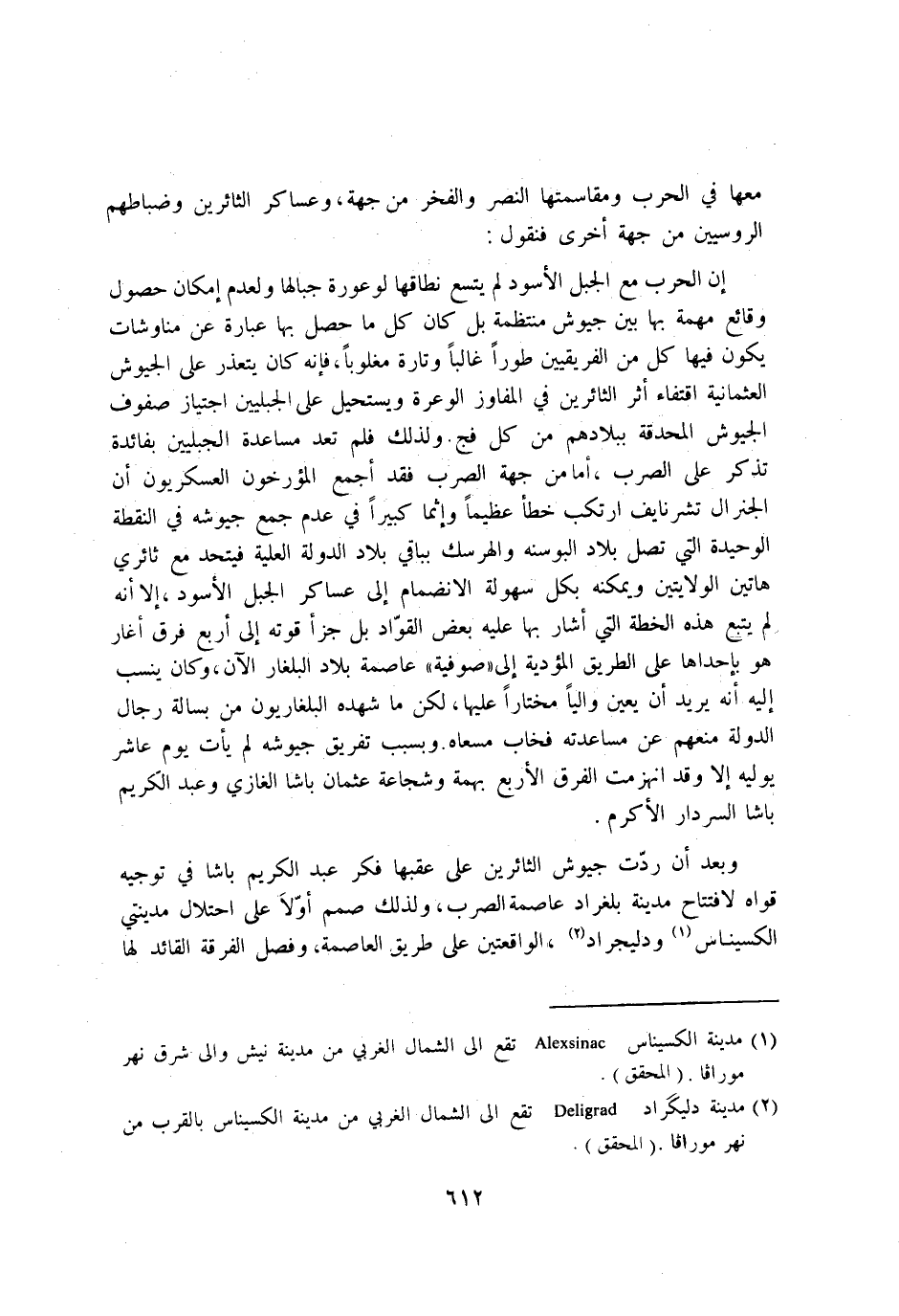 ان الْحَرْب مَعَ الْجَبَل الاسود لم يَتَّسِع نطاقها لوعورة جبالها وَلعدم امكان حُصُول وقائع مهمة بهَا بَين جيوش منتظمة بل كَانَ كل مَا حصل بهَا عبارَة عَن مناوشات يكون فِيهَا كل من الفريقيين طورا غَالِبا وَتارَة مَغْلُوبًا فانه كَانَ يتَعَذَّر على الجيوش العثمانية اقتفاء اثر الثائرين فِي المفاوز الوعرة ويستحيل على الجبليين اجتياز صُفُوف الجيوش المحدقة ببلادهم من كل فج وَلذَلِك فَلم تعد مساعدة الجبليين بفائدة تذكر على الصرب اما من جِهَة الصرب فقد اجْمَعْ المؤرخون العسكريون ان الجنرال تشرنايف ارْتكب خطأ عَظِيما واثما كَبِيرا فِي عدم جمع جيوشه فِي النقطة الوحيدة الَّتِي تصل بِلَاد البوسنه والهرسك بباقي بِلَاد الدولة الْعلية فيتحد مَعَ ثائري هَاتين الولايتين ويمكنه بِكُل سهولة الانضمام إِلَى عَسَاكِر الْجَبَل الاسود الا انه لم يتبع هَذِه الخطة الَّتِي اشار بهَا عَلَيْهِ بعض القواد بل جزأ قوته إِلَى ارْبَعْ فرق اغار هُوَ باحداها على الطَّرِيق المؤدية إِلَى صوفية عَاصِمَة بِلَاد البلغار الْآن وَكَانَ ينْسب اليه انه يُرِيد ان يعين واليا مُخْتَارًا عَلَيْهَا لَكِن مَا شهده البلغاريون من بسالة رجال الدولة مَنعهم عَن مساعدته فخاب مسعاه وبسبب تَفْرِيق جيوشه لم يَأْتِ يَوْم عَاشر يوليه الا وَقد انْهَزَمت الْفرق الاربع بهمة وشجاعة عُثْمَان باشا الْغَازِي وَعبد الْكَرِيم باشا السردار الاكرم